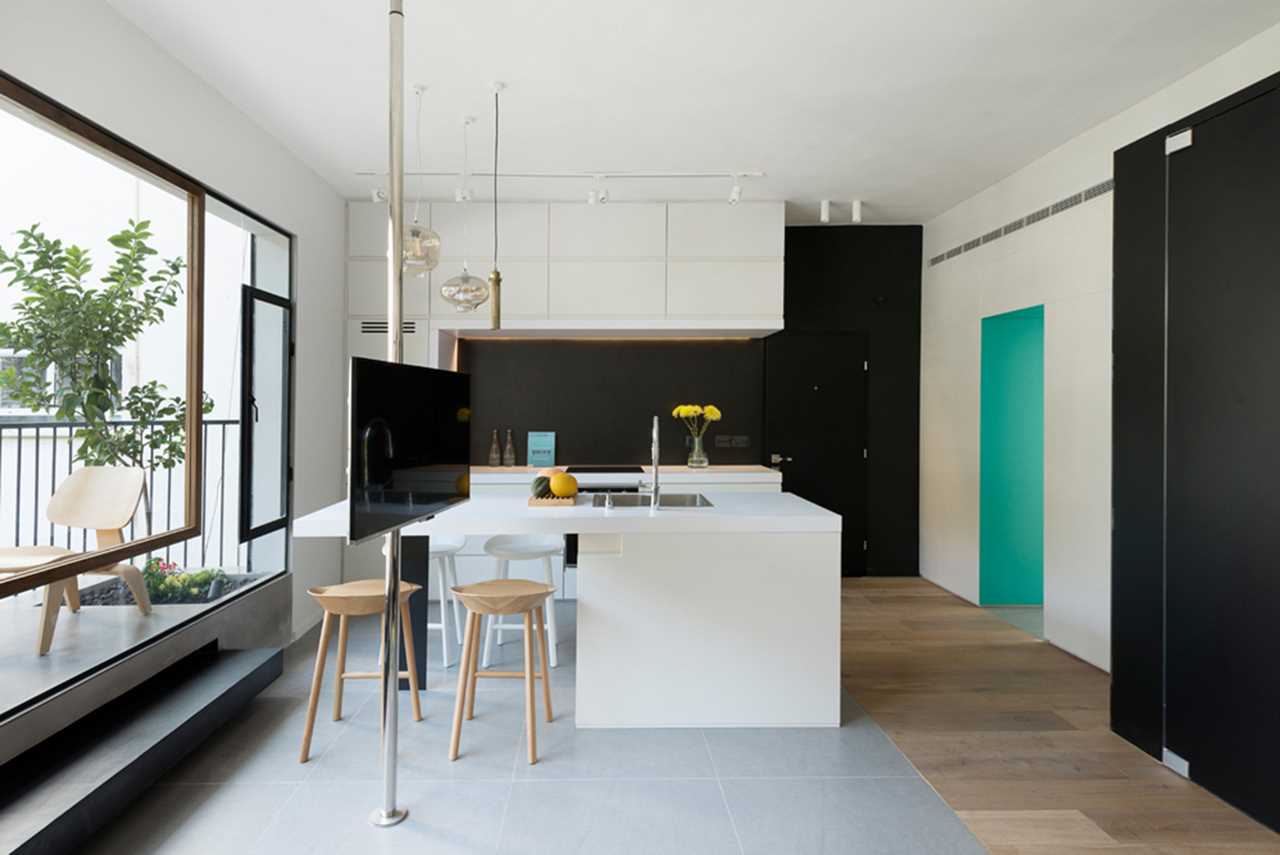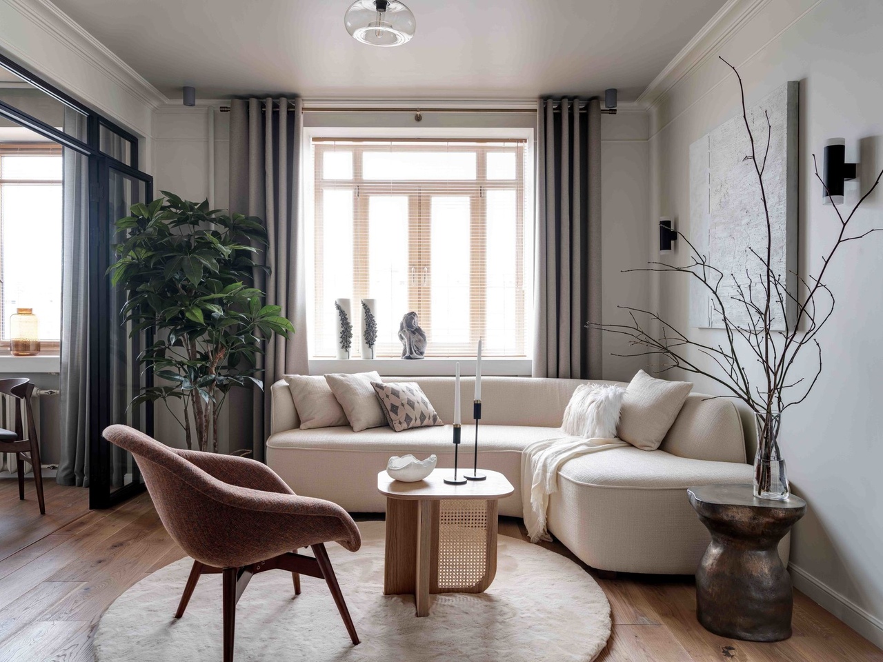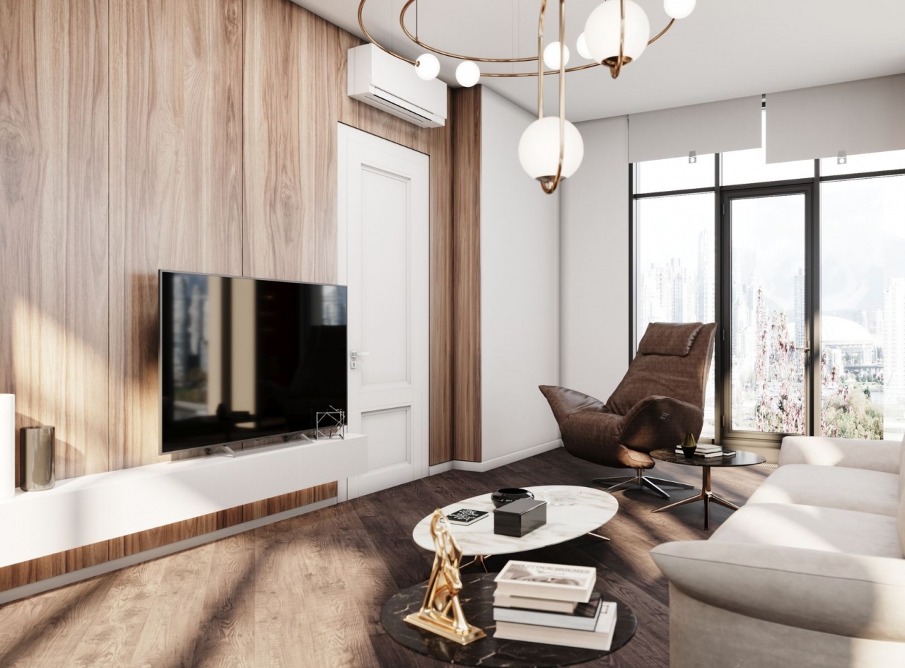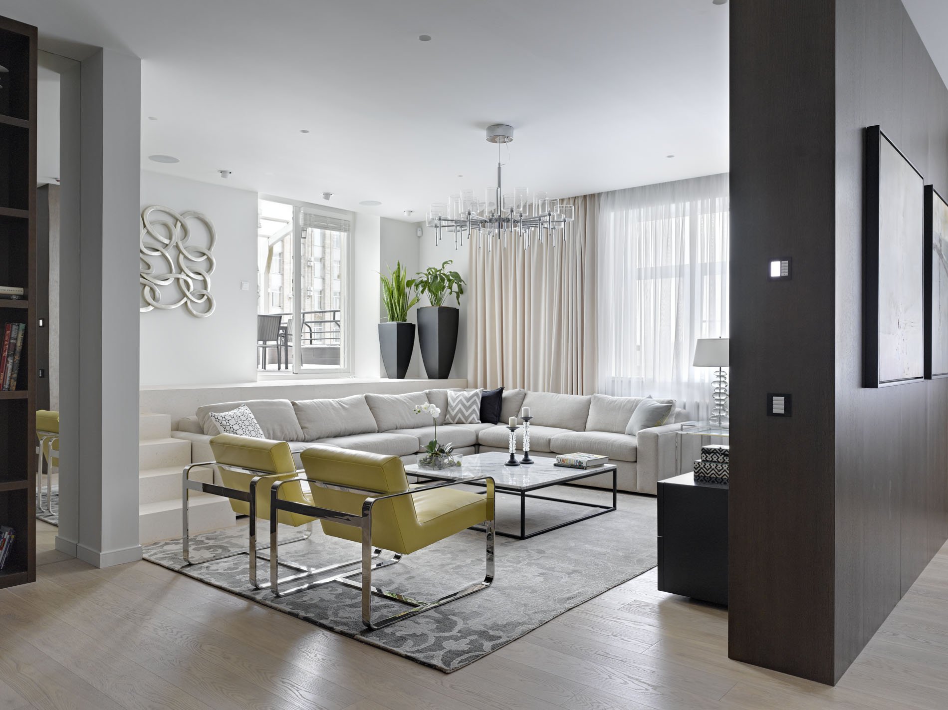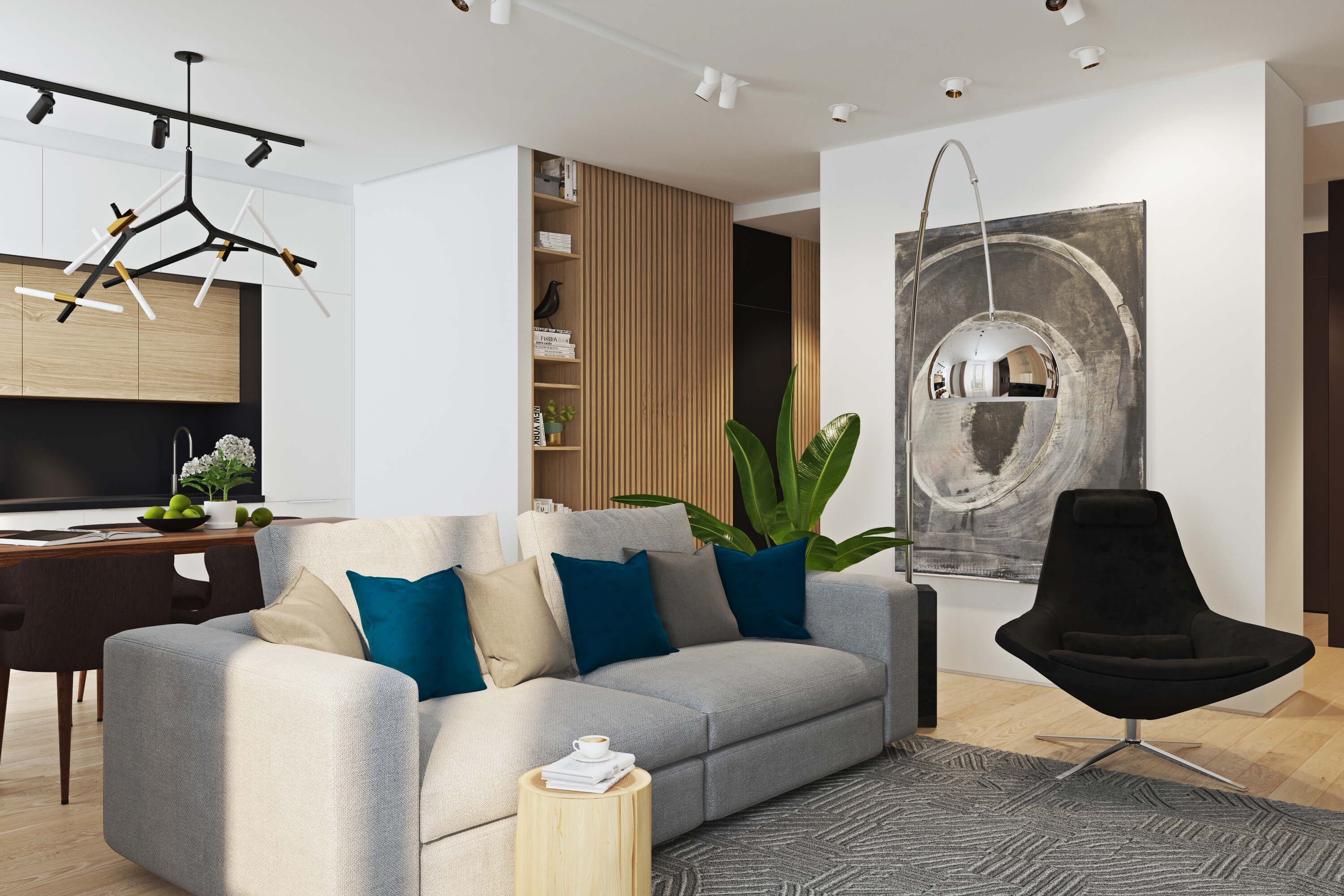 - Un petit appartement, décoré principalement dans des couleurs blanches, aura l'air très élégant et frais.... Un canapé d'angle gris, une table basse sombre, un tapis de sol gris pâle et une télévision murale noire seront harmonieux ici. Les derniers détails dilueront efficacement la blancheur du décor scandinave.