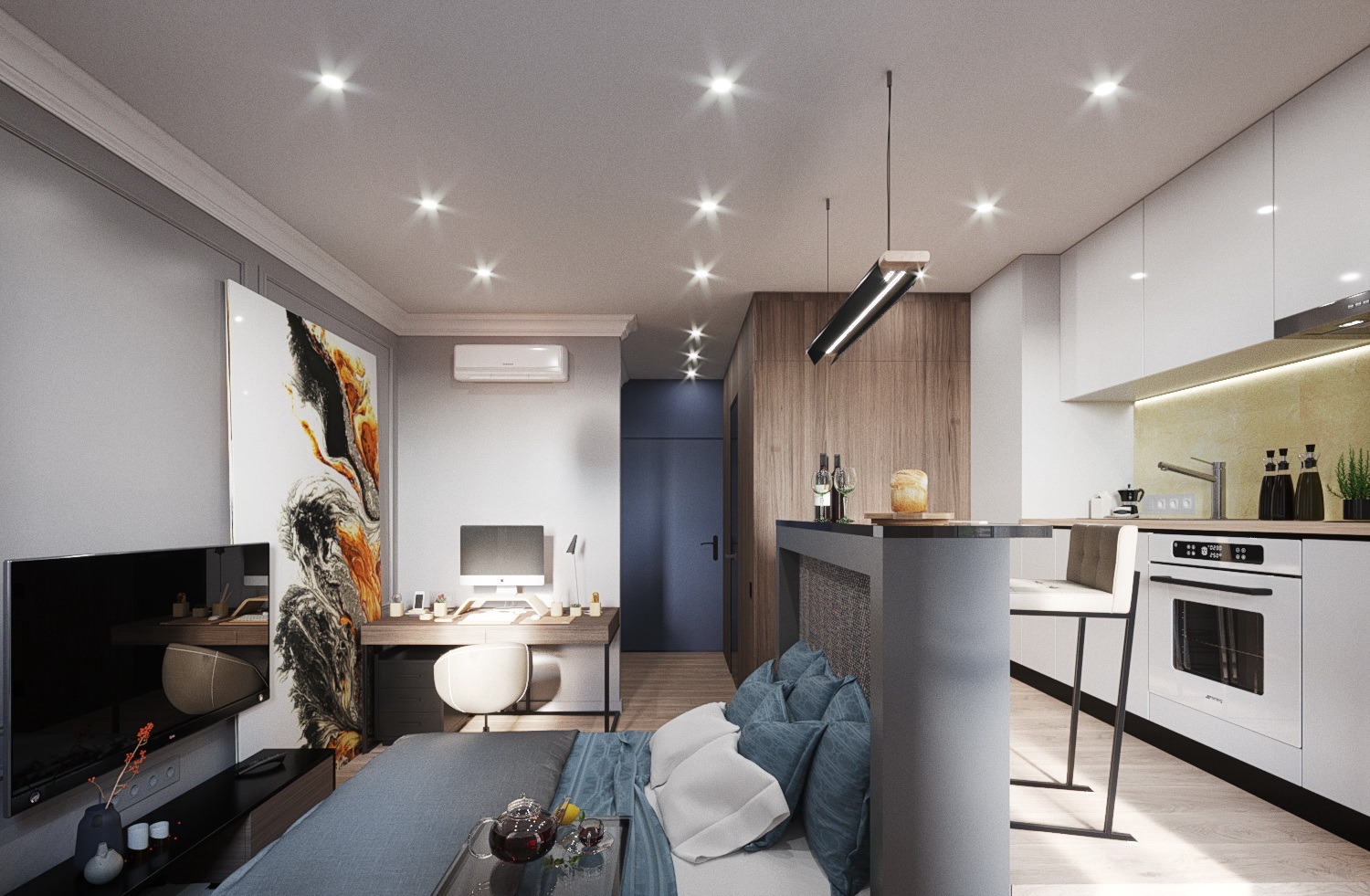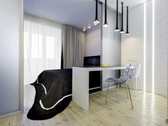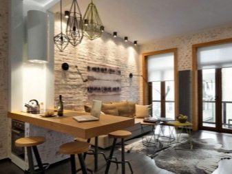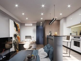 Il est recommandé de placer les dispositifs d'éclairage conformément aux zones fonctionnelles précédemment attribuées par les propriétaires. Si nous parlons d'un petit studio, il n'est pas nécessaire de suspendre des lustres. Il suffit amplement d'ajouter de belles appliques d'un style approprié au plan d'un tel logement, des spots, des lampadaires, des bandes LED au plafond, des spots.