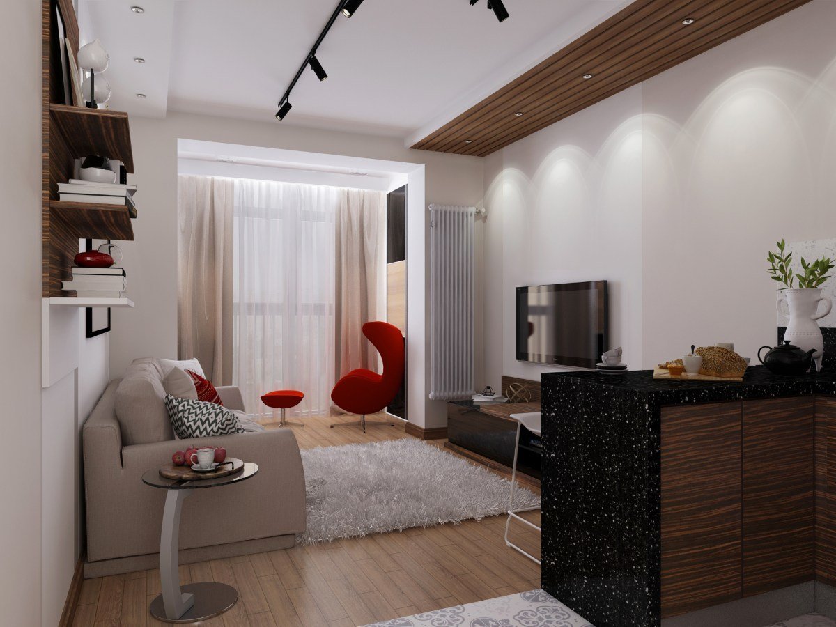 - Sur 32 mètres carrés, il est possible de créer un intérieur original, mêlé de tons blancs et rouges. Vous pouvez placer un canapé droit blanc comme neige contre l'un des murs et un meuble télé sombre en face. Cette zone doit être séparée de la chambre par une cloison décorative avec étagères. Derrière, il y aura de la place pour un lit blanc, complété par des détails textiles rouges. A droite du séjour, il sera possible d'équiper un coin cuisine.