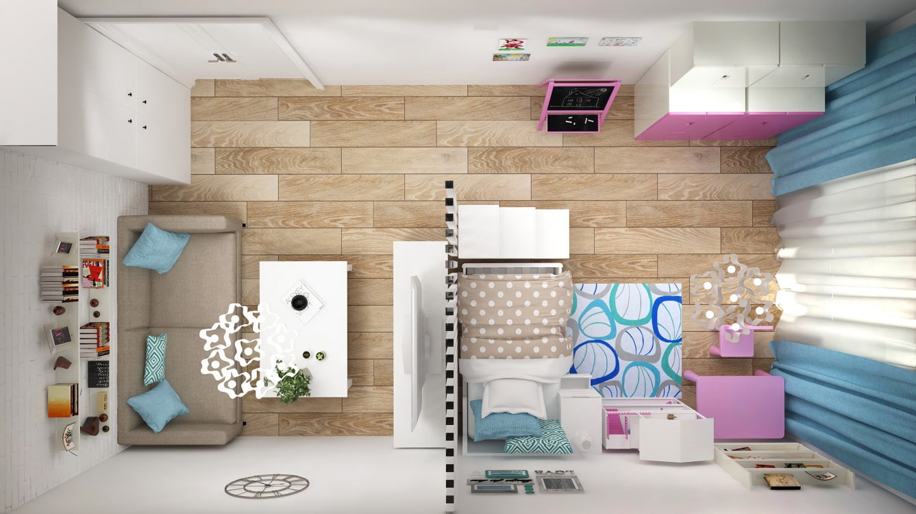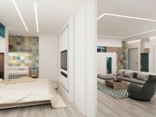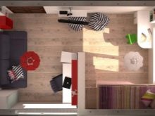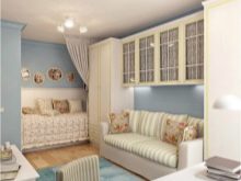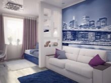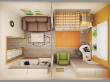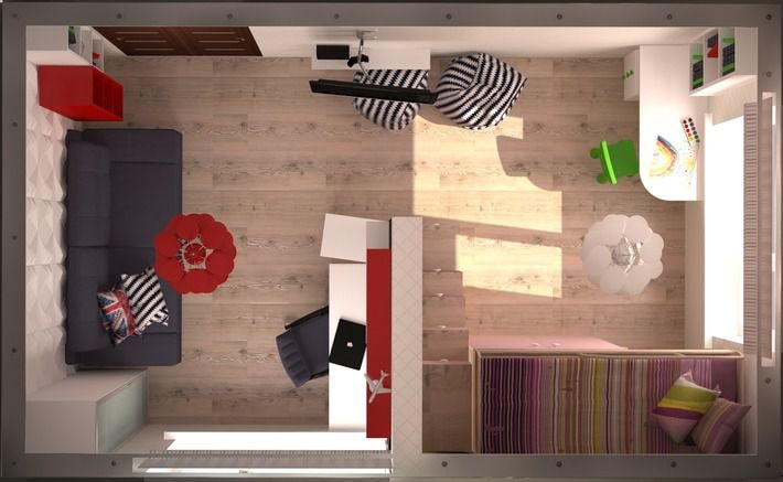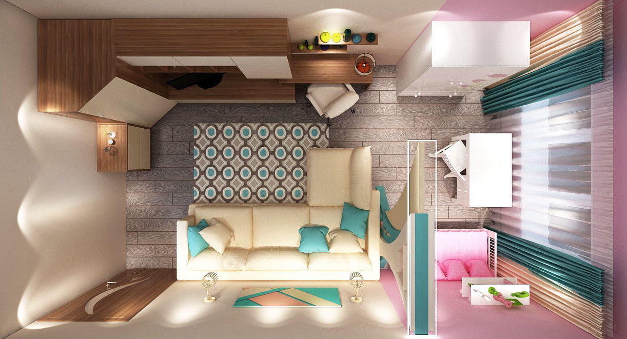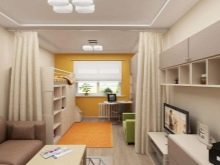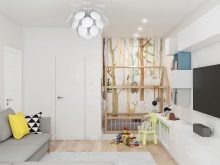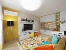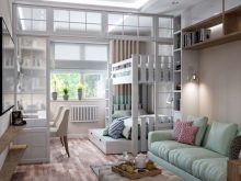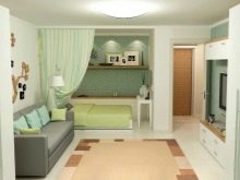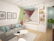 Lors de l'aménagement d'un appartement d'une pièce avec un zonage pour les zones enfants et adultes, il est important d'utiliser un minimum de mobilier. Ainsi, l'encombrement peut être évité. Il est extrêmement important de prendre en compte que les dimensions de chaque élément individuel de l'intérieur correspondent aux dimensions de la pièce et que leur emplacement ne gêne pas le passage.