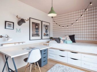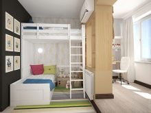 Il est approprié d'utiliser des cloisons sèches comme séparateur. Dans la zone des adolescents, il est préférable d'aménager un endroit pour dormir, qui se composera de plusieurs niveaux. Au 1er étage, il faut qu'il y ait un placard où l'enfant puisse ranger ses affaires, et le niveau supérieur jouera le rôle d'un lit. Cette conception prend en fait peu de place, tout en étant caractérisée comme un casque multifonction.