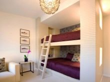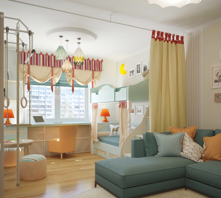 Il est beaucoup plus difficile d'organiser des meubles pour les jumeaux, en particulier pour les enfants de sexes différents. Tant qu'ils sont bébés, il n'y a pas de problèmes, l'essentiel est de se rappeler que vous ne pouvez pas mettre de berceaux à côté de la fenêtre. Avec le processus de croissance des enfants, les parents devront acheter un lit superposé. Il est recommandé de le placer près du mur, loin de la fenêtre. Eh bien, lorsque les enfants commenceront à aller à l'école, chacun devra aménager son propre espace. Les enfants pourront aménager leurs zones à leur gré.