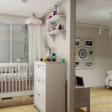 - Pour un nouveau-né, il convient de faire une petite zone. En guise de délimiteur, vous pouvez installer une armoire dans laquelle seront rangés les vêtements des enfants.