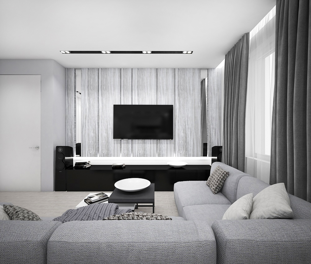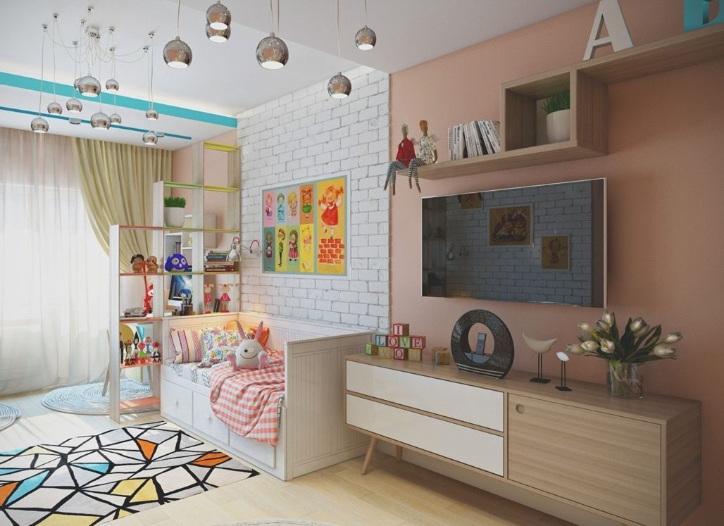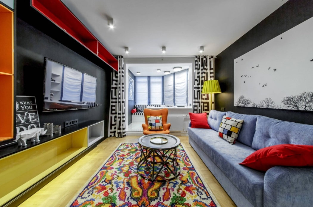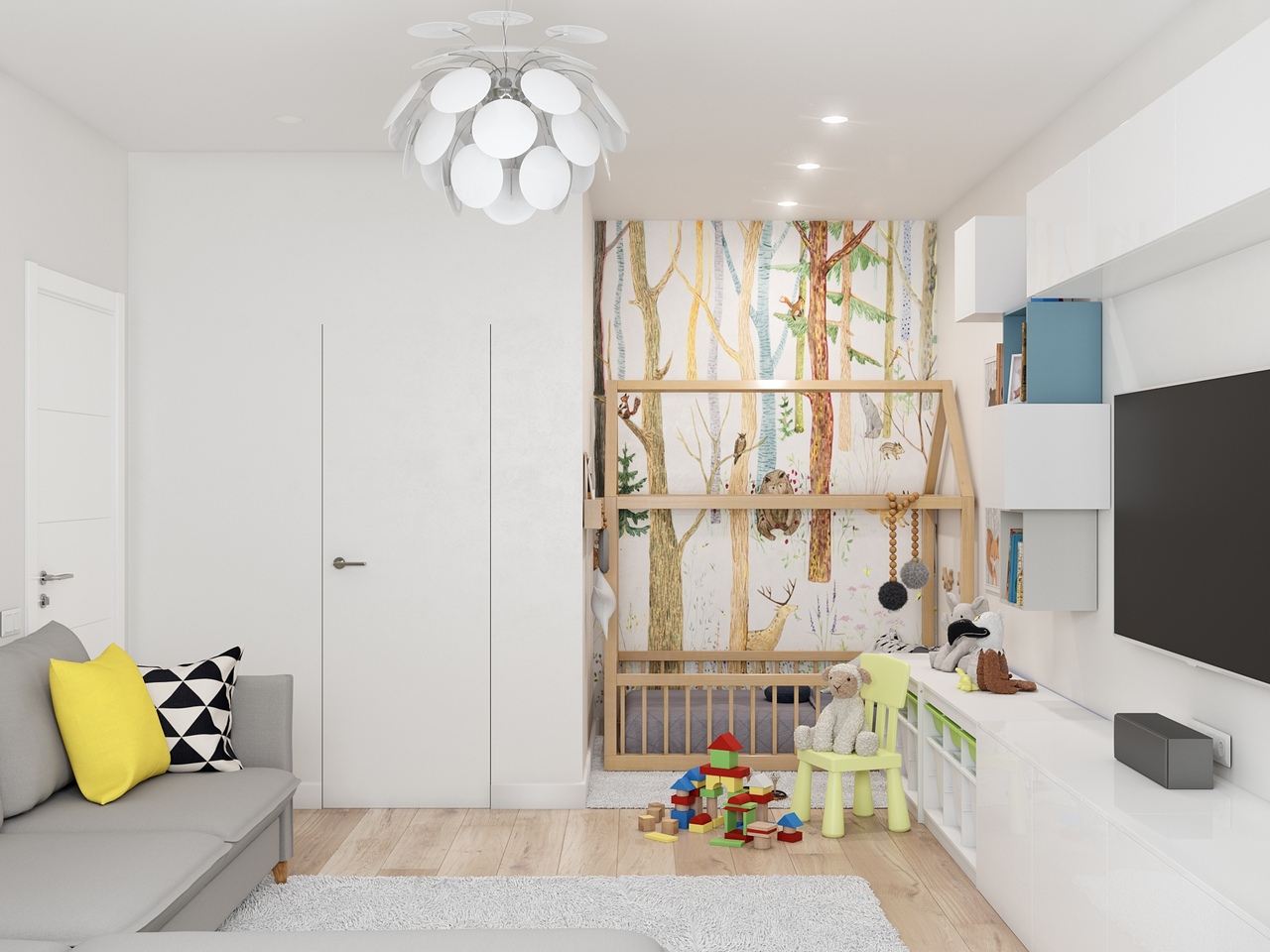 Si les parents et l'enfant ne peuvent pas faire un choix ou trouver un compromis ensemble, il est nécessaire de faire un zonage avec des cloisons en plaques de plâtre et de créer leur propre style intérieur dans chaque espace séparé. Par exemple, l'espace adulte sera conçu dans un style minimaliste, idéal aussi bien pour la chambre que pour le salon. Et la chambre où vit l'enfant peut être réalisée en version scandinave.