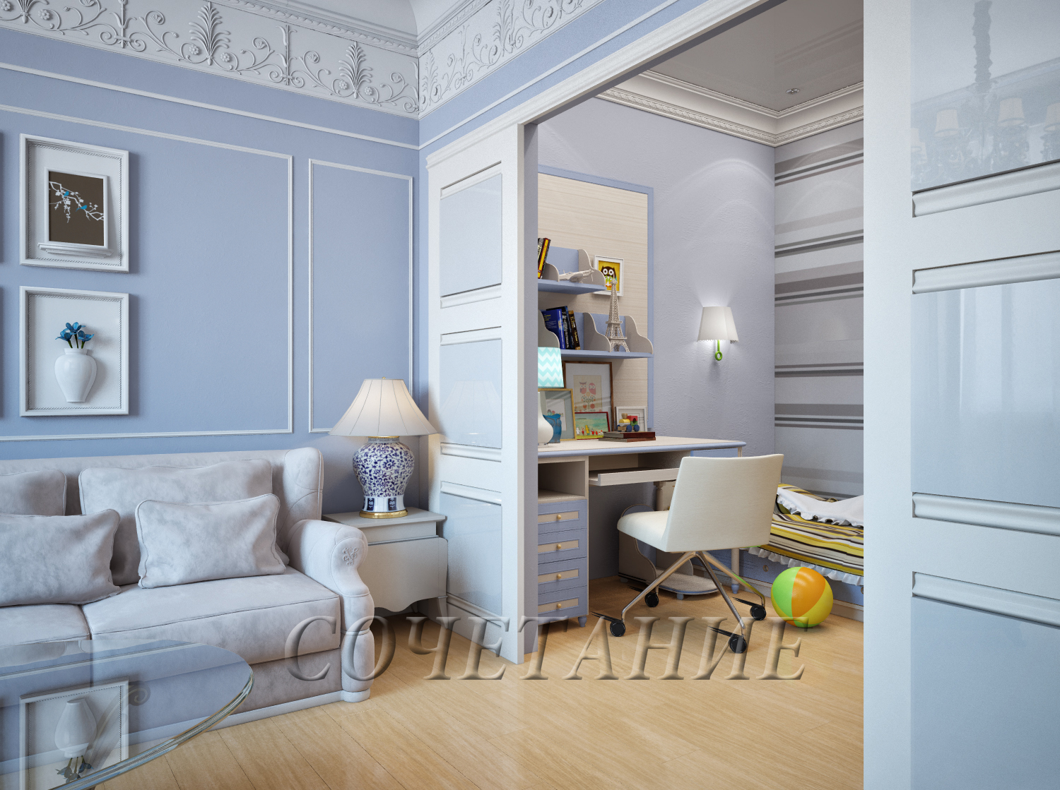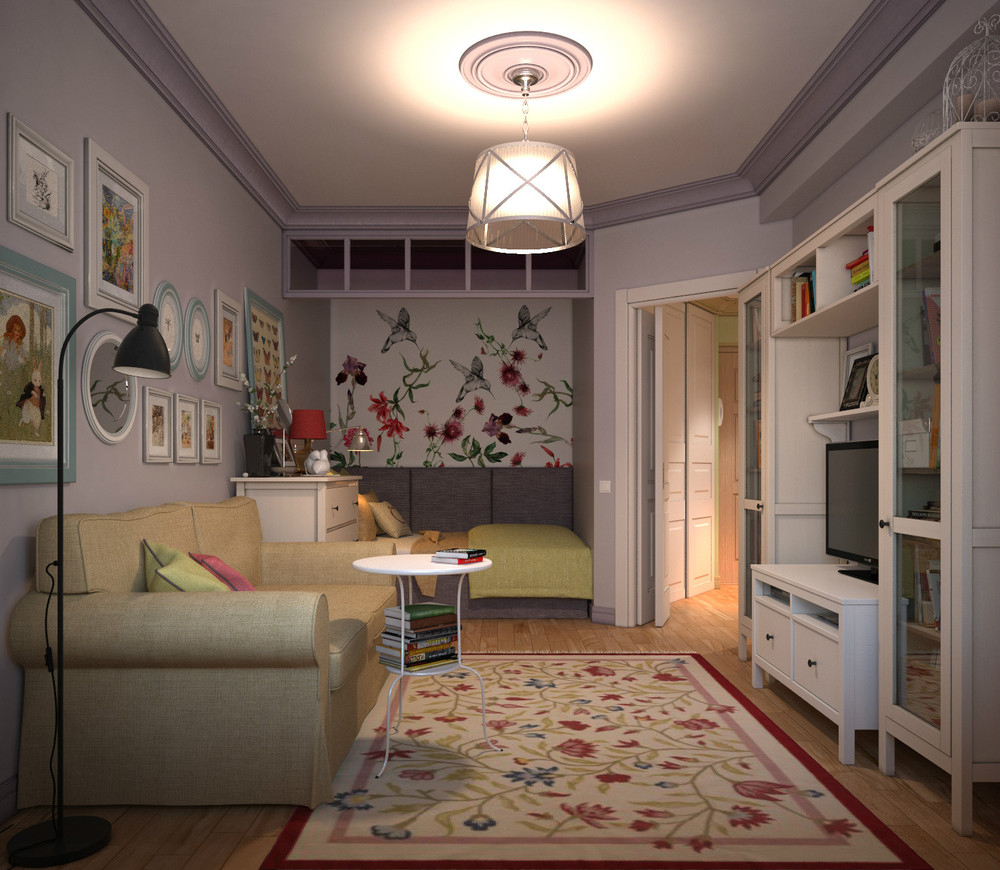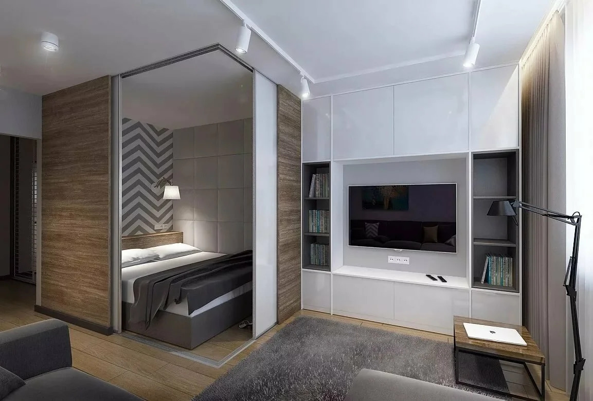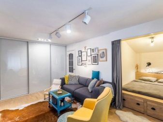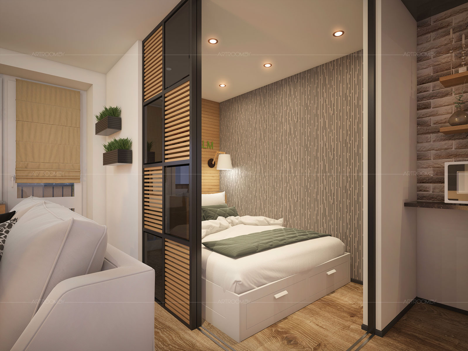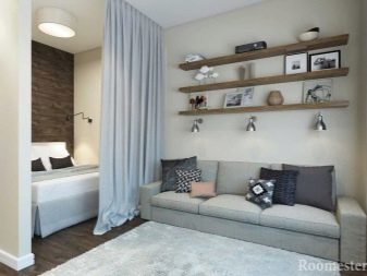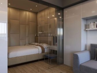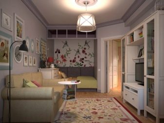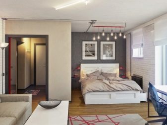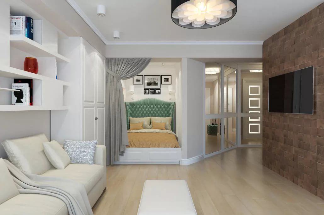 Lors de la création d'un intérieur dans un appartement d'une pièce avec un espace pour les meubles ou autres objets, les options de transformations possibles sont également prises en compte. Dans le cas où le renfoncement était auparavant utilisé comme chambre, il peut ensuite être transformé en bureau ou en aire de jeux pour enfants.