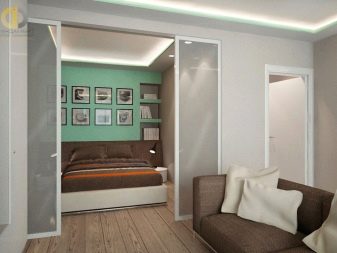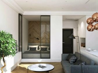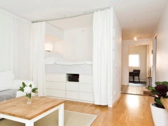 Pour séparer la structure de la pièce, il est préférable de choisir des structures mobiles plutôt que fixes. Ils ne prendront pas beaucoup de place et ne surchargeront pas la pièce. Il convient de garder à l'esprit que les structures fixes seront beaucoup plus difficiles à changer que les rideaux ou les rideaux ordinaires. S'il est nécessaire de séparer la pièce de la niche, des portes coulissantes sont souvent utilisées.