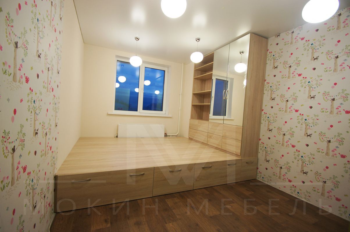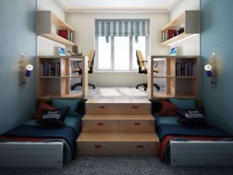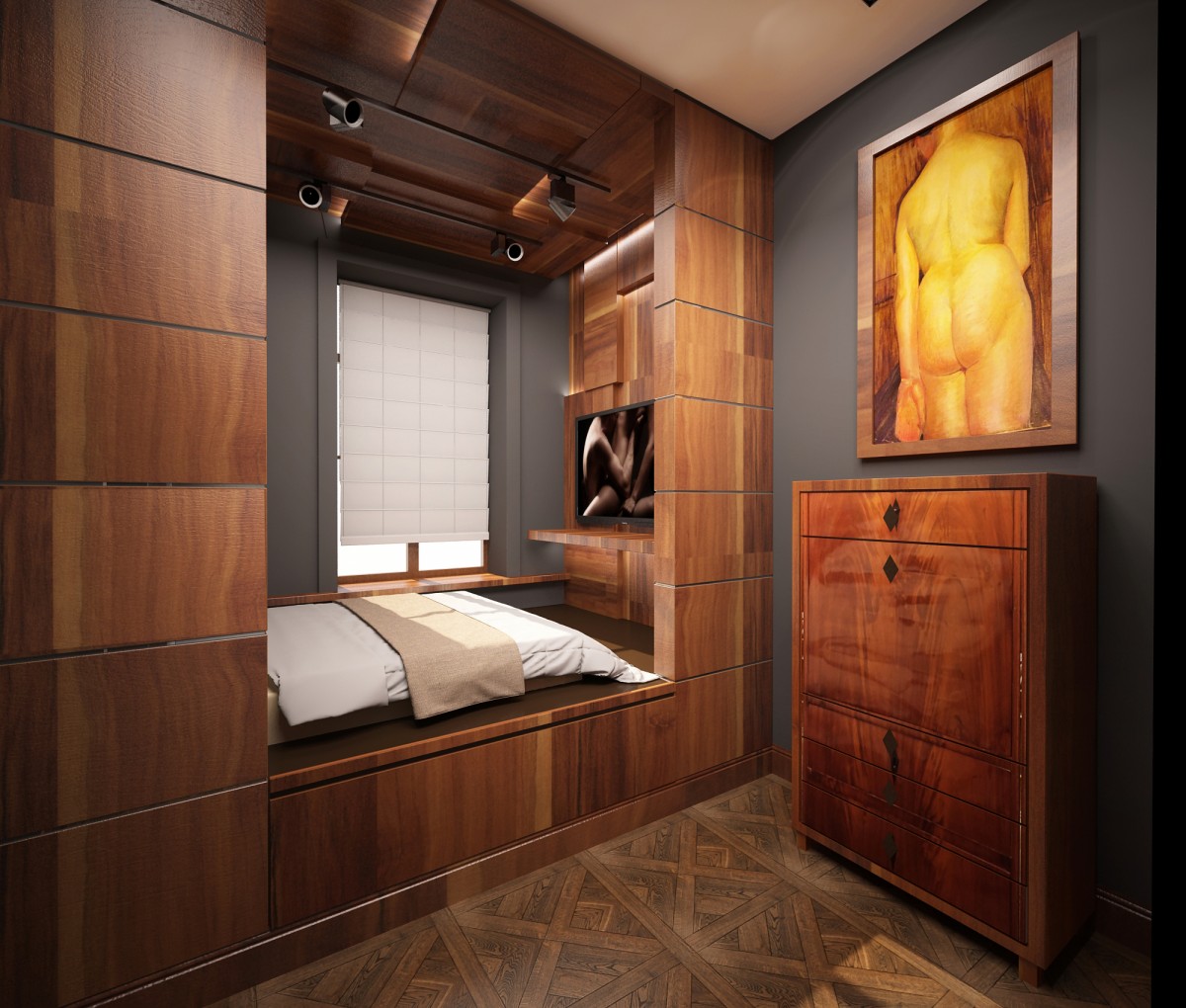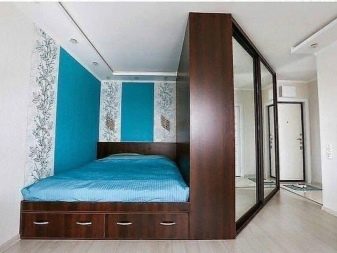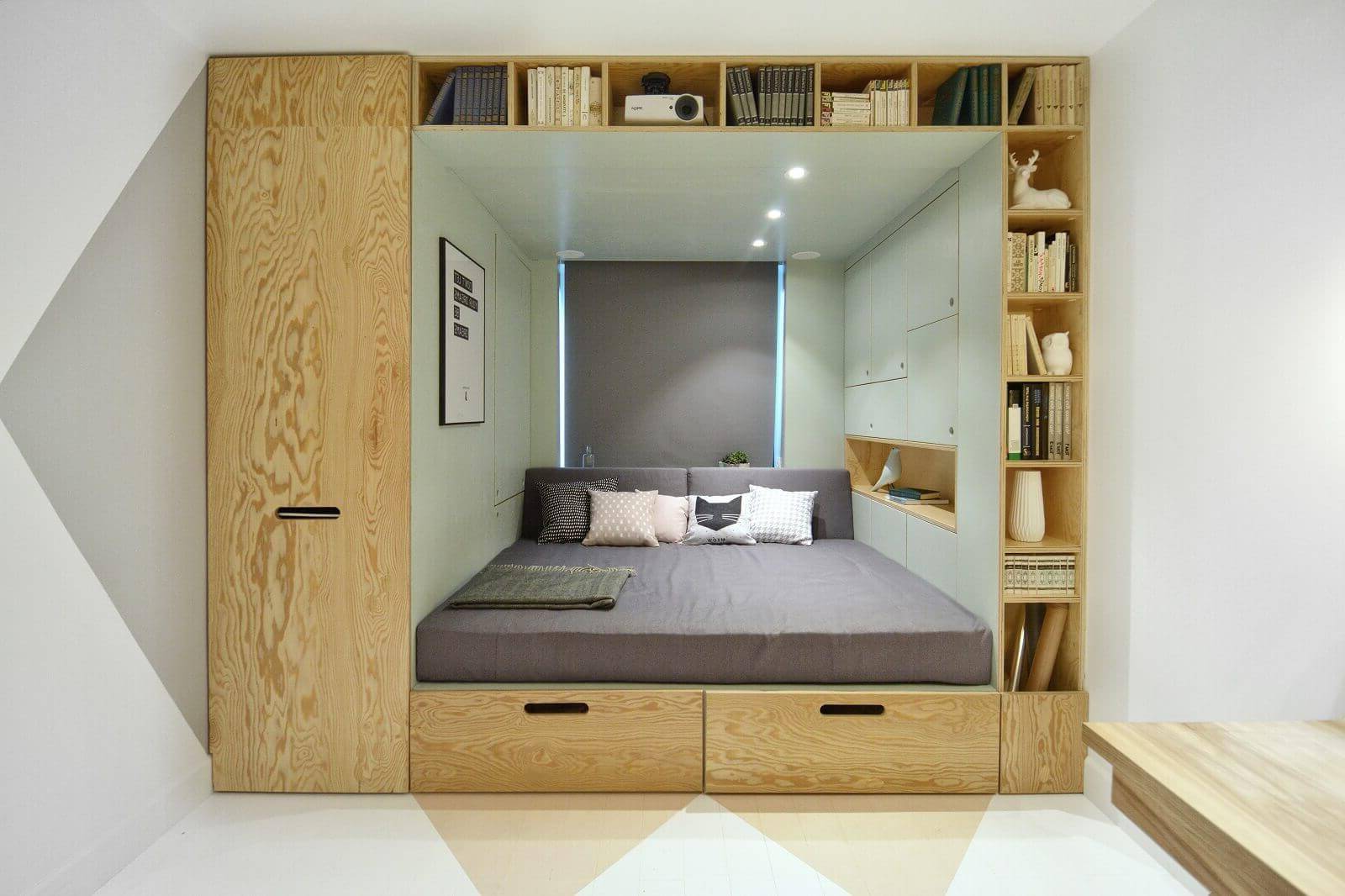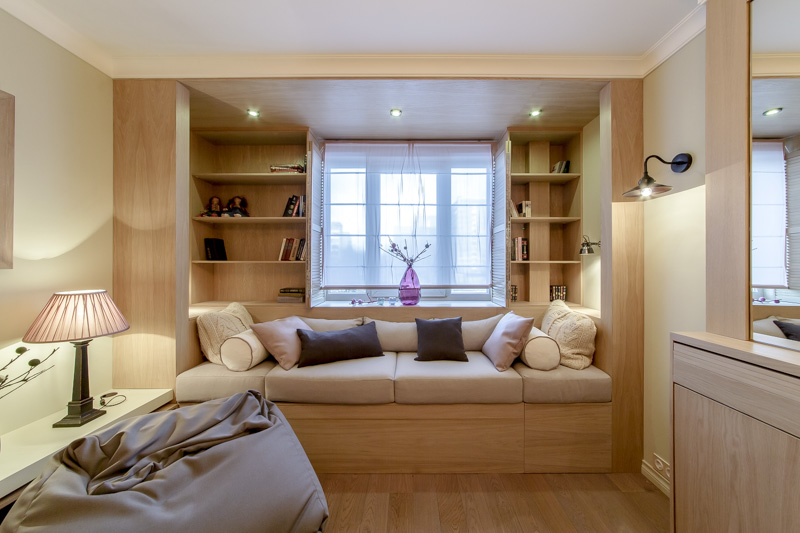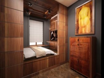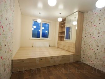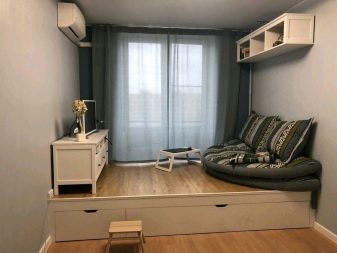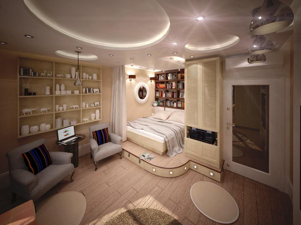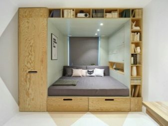 Pour les espaces exigus, les structures élévatrices ou modulaires sont plus adaptées.Les meubles intégrés dans ce cas seront une excellente option, avec une taille limitée de l'évidement. Cela pourrait être un lit sur un podium avec un système de rangement fourni.