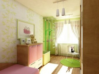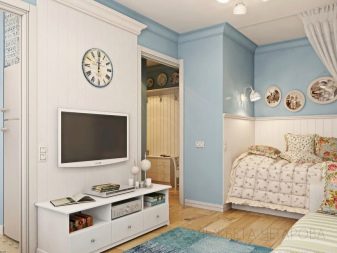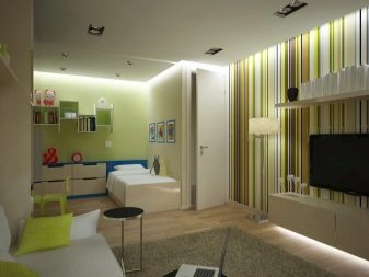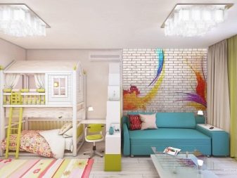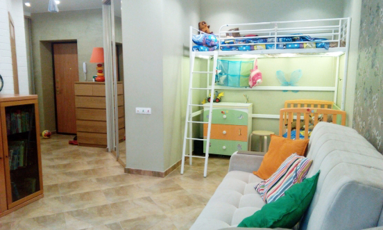 - Espace enfants. La présence d'une telle zone permettra à l'enfant d'avoir son propre espace séparé, en même temps, les parents pourront obtenir un peu plus de liberté de leur bambin. A cet endroit, un modèle à deux niveaux ou un lit de type mansardé, qui combine un couchage avec des étagères, une table ou une commode, serait idéal.