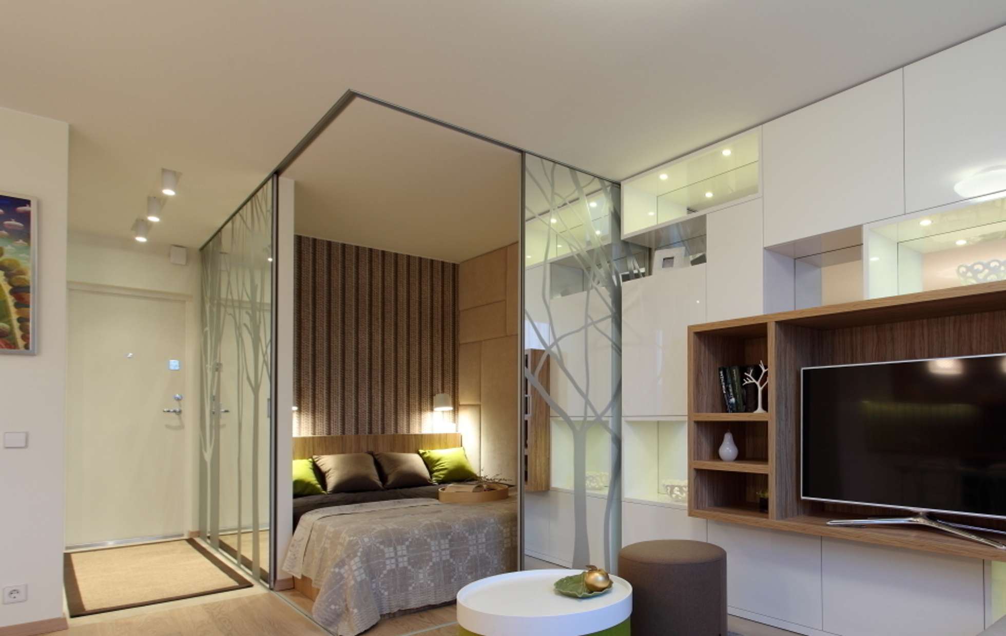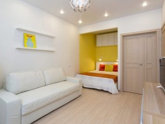Conception d'appartements d'une pièce avec une niche dans la vidéo ci-dessous.