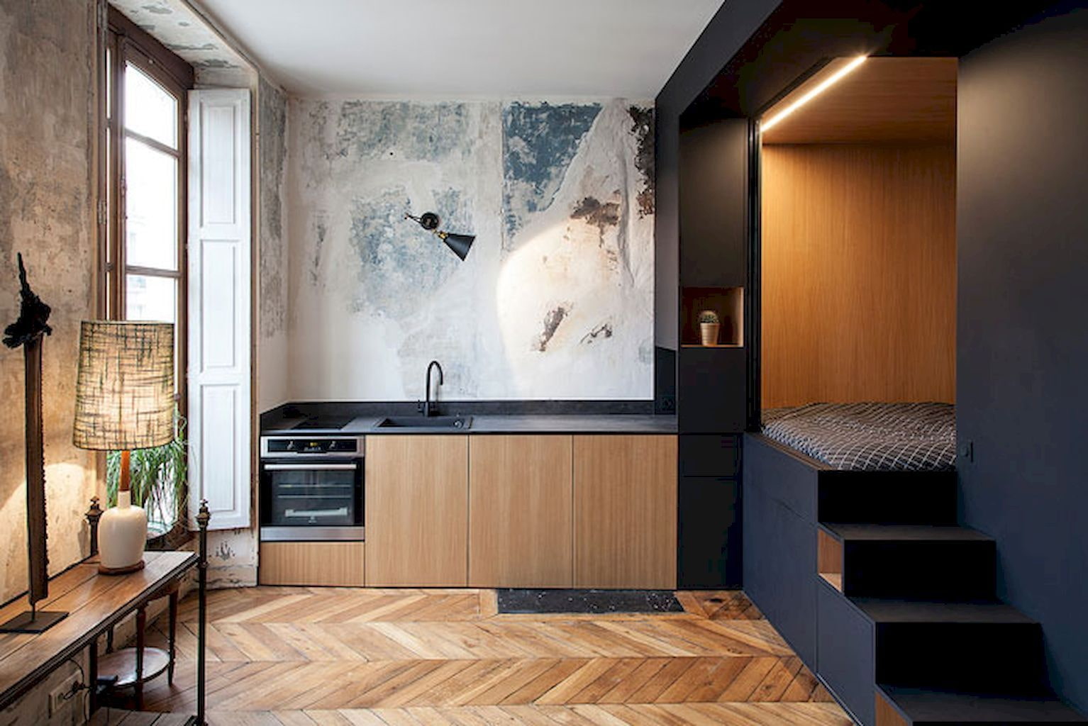 - Les niches sont également utilisées pour y organiser des cuisines. Compte tenu de la taille, une petite table pliante, des tabourets et un petit lit à tréteaux peuvent y trouver place.