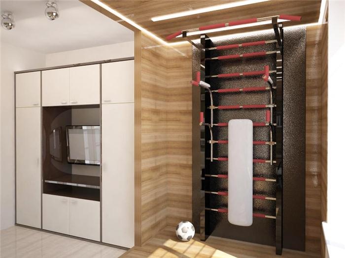 - Vous pouvez également utiliser cet endroit comme lieu d'entraînement sportif. L'espace dans le mur est également adapté pour installer ici des barres murales, une machine d'exercice compacte et des équipements sportifs.