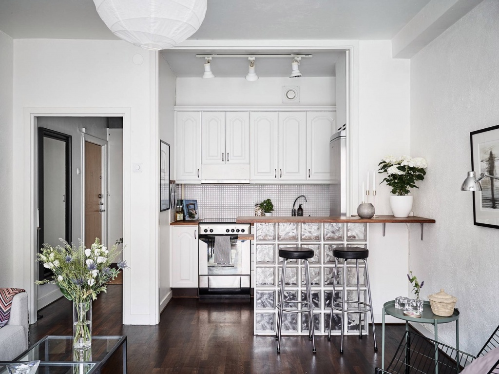 Dans le cas où une fenêtre est prévue dans la niche, l'espace n'est pas séparé du reste de la pièce, afin de ne pas priver de lumière supplémentaire. Dans un espace vertical étroit, une place est réservée à une machine à laver ou à un réfrigérateur, ou ils y font un comptoir de bar.