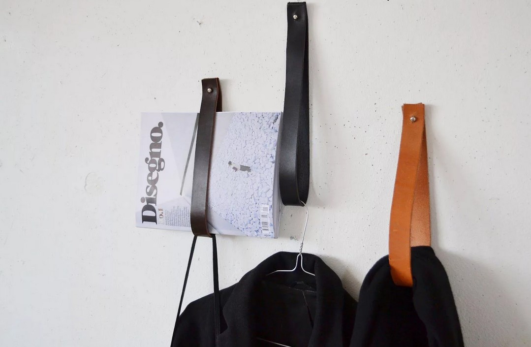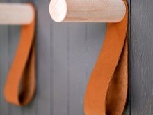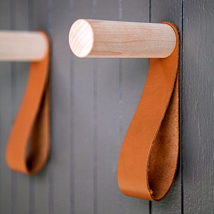 Aussi, un beau modèle sortira de lanières de cuir. Ce cintre peut compléter presque n'importe quel intérieur. En même temps, il est fait rapidement et sans effort. Pour la construction, vous aurez besoin d'une paire de ceintures, de morceaux de cuir, d'une branche en bois, de crochets métalliques rigides, de fils avec une aiguille, de ciseaux et d'une perforatrice.