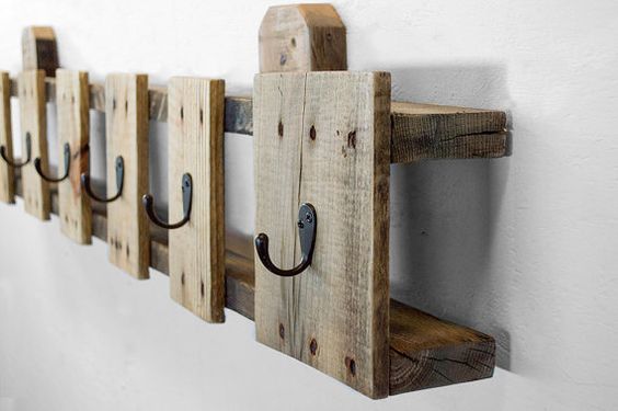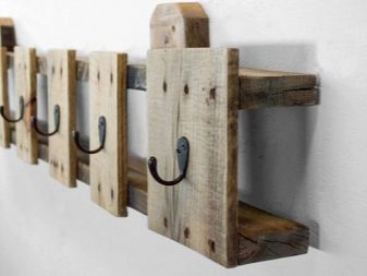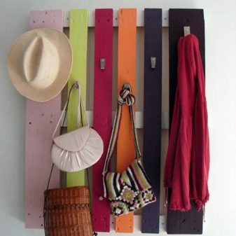 - Variantes de plaques. L'apparence d'un tel cintre dépend des ferrures et de la base de support. Si les crochets sont placés sur des lattes de bois séparées et disposées verticalement, vous obtenez un produit sous la forme d'une clôture.Les sommets de ces bandes peuvent être affûtés ou coupés à la vague. La base en bois est peinte dans une couleur spécifique ou recouverte d'un vernis transparent, soulignant la texture du bois. Si les lattes sont placées du plafond au sol et peintes dans une couleur vive et accrocheuse, le cintre rehaussera visuellement le couloir et soulignera la splendeur de sa palette de couleurs principale. Une chaise ou un pouf, assorti à la couleur des planches, peut devenir un accent particulier.