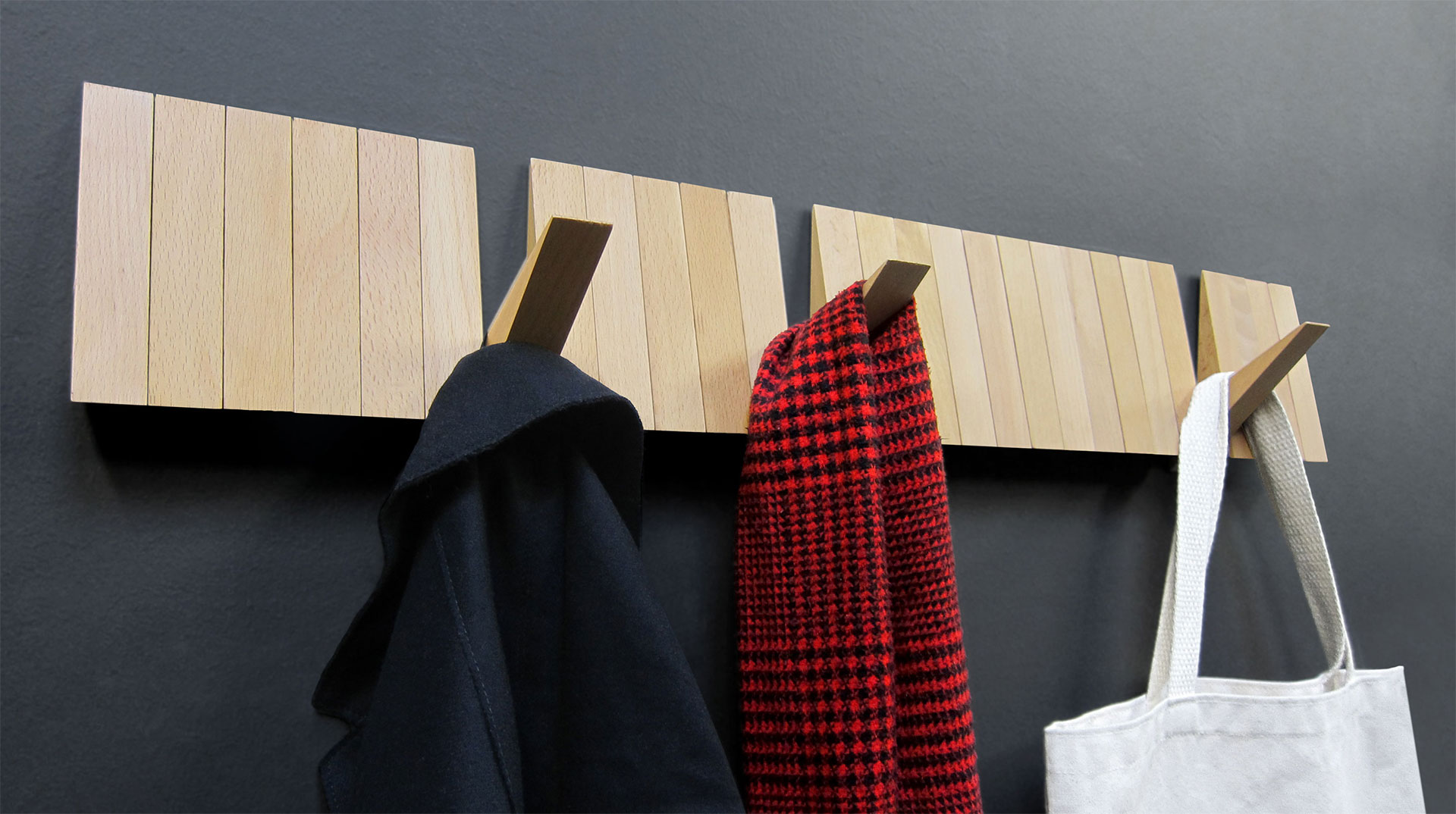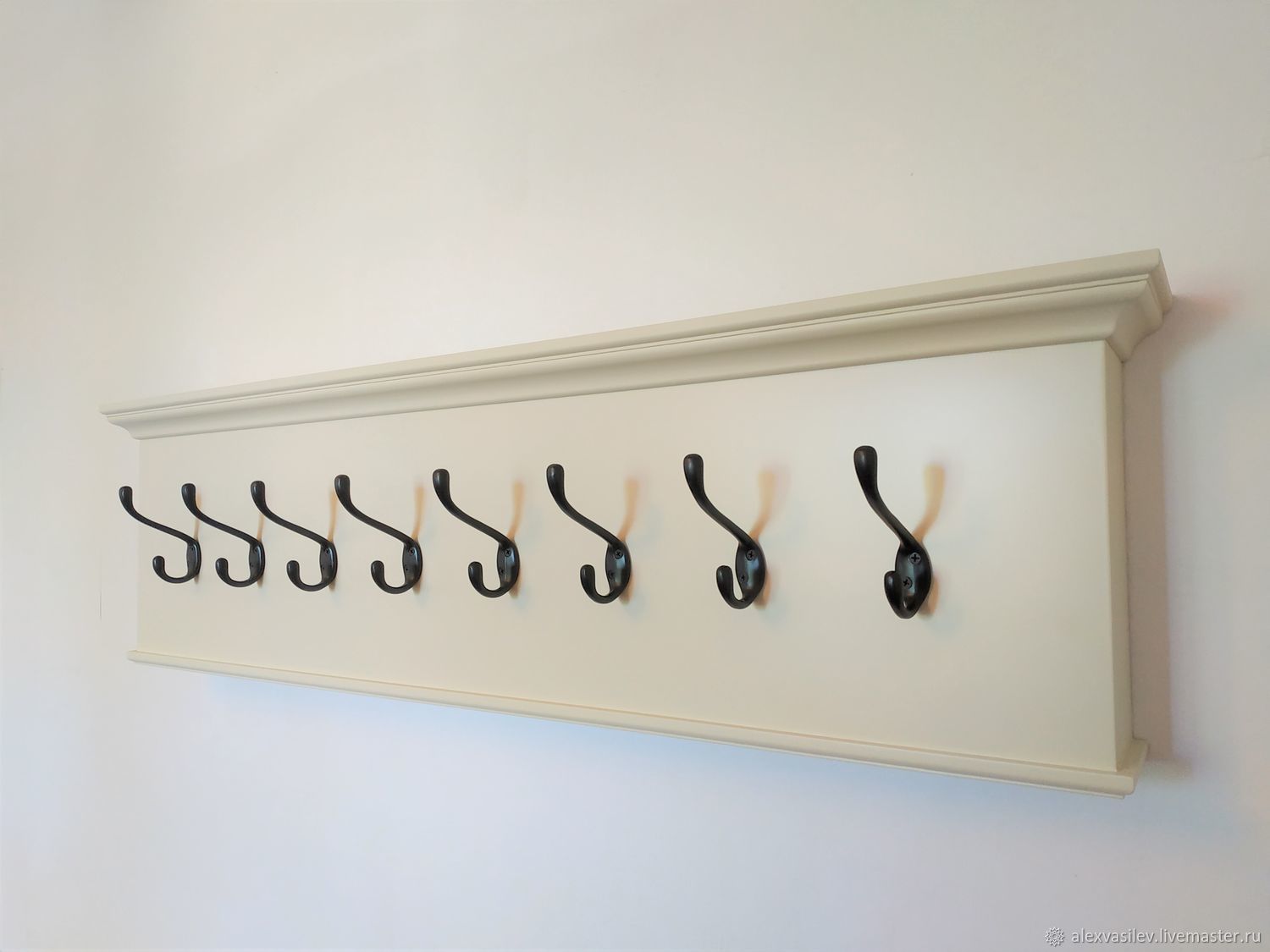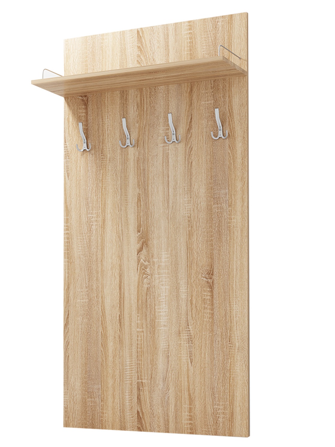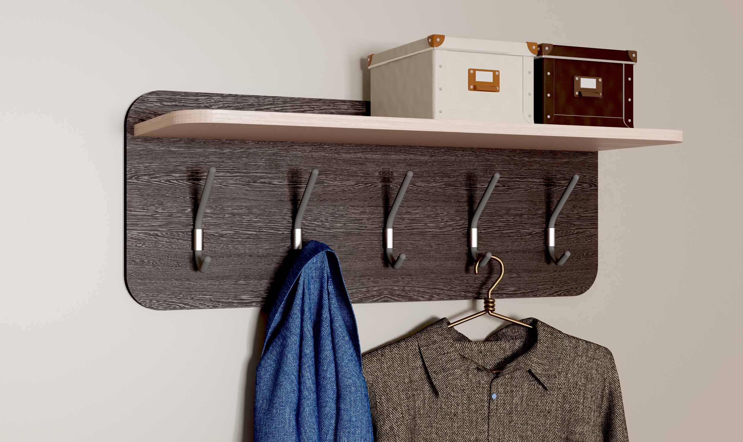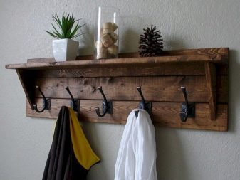 Dans le réseau de vente au détail, il est facile de récupérer des modèles en aggloméré. Ils peuvent être beige, gris, blanc et autres couleurs. Une telle variété de nuances vous permet d'utiliser une base qui correspond parfaitement à la couleur du papier peint. À partir de panneaux de particules, vous pouvez construire indépendamment un cintre sous la forme d'un panneau mural avec des crochets. En attachant un bâton sur le dessus, vous pouvez obtenir une structure de deux modules. La partie verticale est utilisée pour les crochets. Des crochets sont attachés à la partie verticale et la partie horizontale est utilisée comme étagère pour les chapeaux.