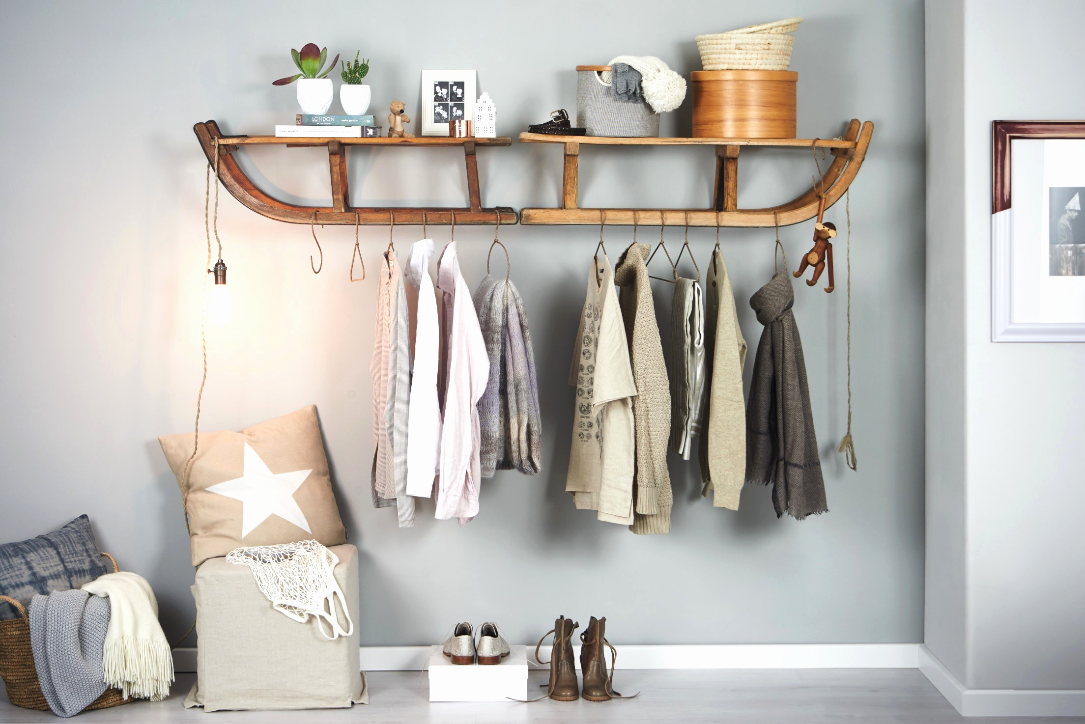 Les meubles originaux créent un style unique pour le couloir. Les cintres de bricolage aideront à lui donner un certain style.