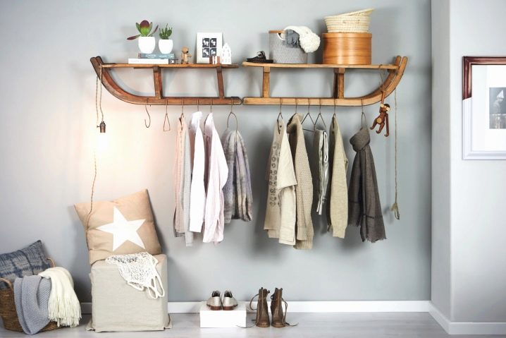 Les cintres en bois fabriqués sous forme de jouets ou d'articles ménagers sont particulièrement originaux. Ainsi, le modèle en forme de traîneau pour enfants suspendu séduira les enfants. Sur son siège, vous pouvez plier des chapeaux et accrocher des vêtements sur les patins avec des crochets.