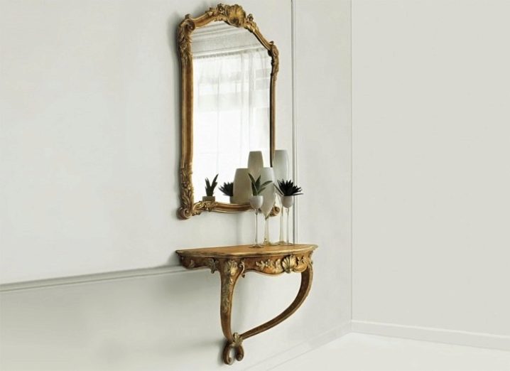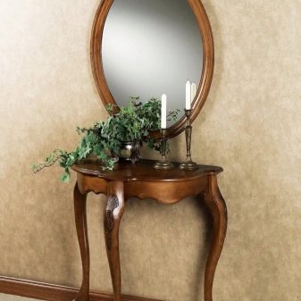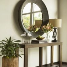 Les formes les plus optimales pour la table sont semi-circulaires et rectangulaires. De plus, il est préférable de rendre le décor aussi sobre que possible. Pour créer un accent au-dessus de la console, vous pouvez accrocher un miroir classique.