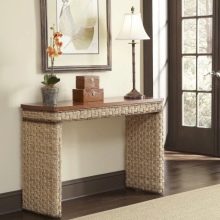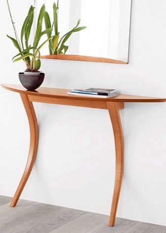 Le bois naturel conquiert par sa pureté écologique. Les tables faites de ce matériau conviennent à de nombreux intérieurs, y compris country, high-tech, minimalisme. Pour donner de l'originalité au bois et souligner ses caractéristiques naturelles, il peut être recouvert d'un vernis transparent ou mat. En raison de la douceur du bois, ses consoles sont souvent complétées par des sculptures ou des incrustations. Parmi les inconvénients, il convient de souligner le coût élevé et les soins exigeants.