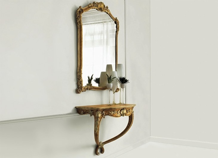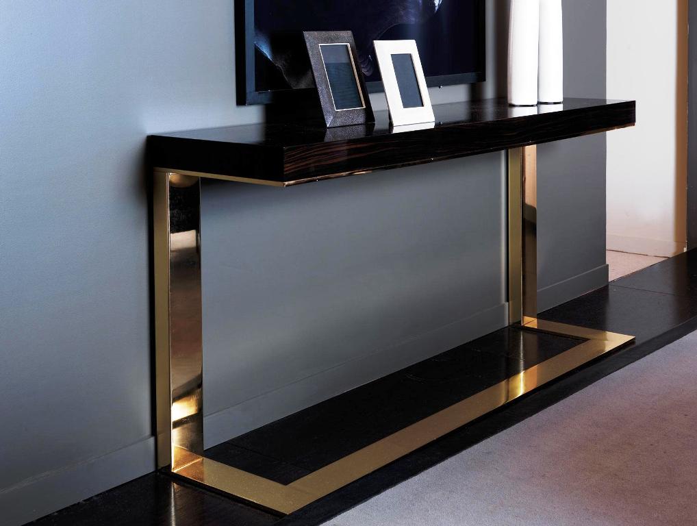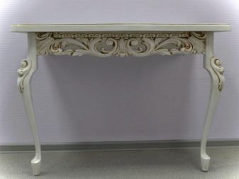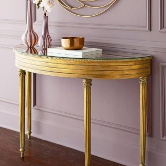 - Les idées de design Art déco sont représentées par des consoles légères et gracieuses. Pour eux, la dentelle forgée, y compris les ornements floraux, sera un excellent ajout. Des pieds en marbre sculpté ou un miroir au design original seront également impressionnants.
