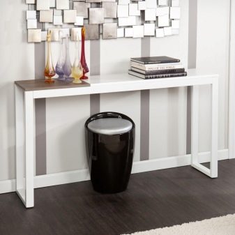 Les options intéressantes pour le couloir seront les modèles sur un cadre en métal avec un plateau en bois ou en verre et des pieds de support forgés. Vous pouvez choisir n'importe quelle couleur de ce design - l'essentiel est qu'il corresponde au style général de l'intérieur. Souvent, les modèles combinés sont fabriqués avec des miroirs ou des tabourets pour apporter confort et confort à la pièce.