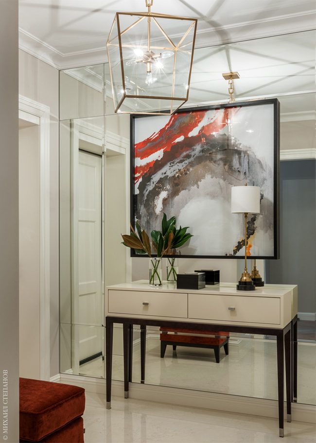 À partir de n'importe quel couloir indéfinissable, vous pouvez en créer un spectaculaire et élégant en choisissant le bon design d'intérieur et en le complétant avec des ustensiles de mobilier intéressants, par exemple une console. Les classiques se marient bien avec des modèles en bois avec des éléments sculptés gracieux. Pour les couleurs, privilégiez le pastel. Une excellente option serait le design noir et blanc de la console. A doses modérées, un supplément de patine ou de dorure est approprié.