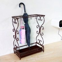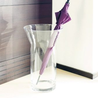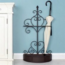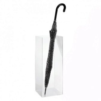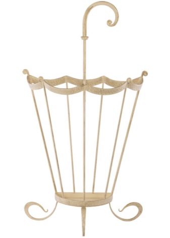 - Il est très important de faire attention au matériau du parapluie. Les options très belles et robustes sont en bois, en métal. Les articles forgés sont également pratiques, mais ils sont plus chers que les articles en plastique disponibles. Les étagères en plastique ont l'air plus simples, elles ne peuvent donc pas jouer le rôle d'un décor spectaculaire à l'intérieur.Les modèles en verre seront une excellente solution. Ils ont fière allure dans les compositions intérieures modernes.