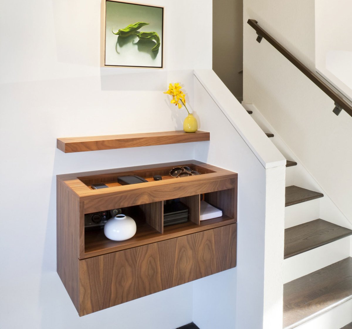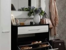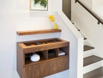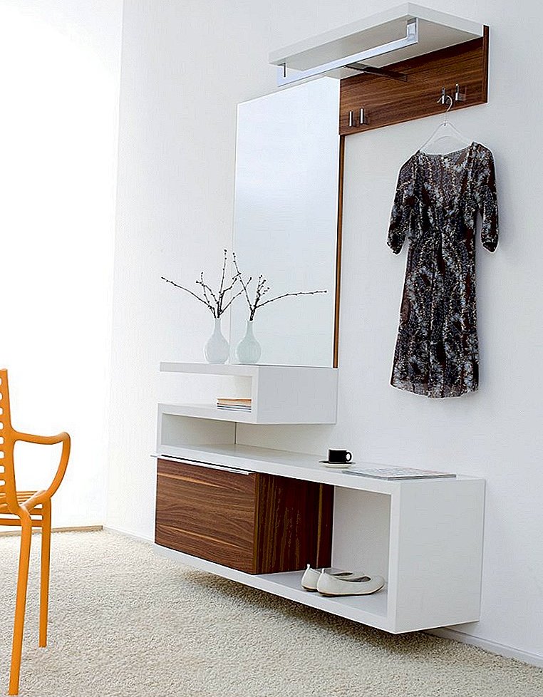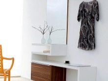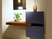 Une armoire suspendue peut servir de table dans le couloir. C'est particulièrement pratique lorsque vous avez besoin de vous ranger avant de sortir, de vous peigner les cheveux. Si l'appartement est d'une pièce et de petite taille, cette solution sera particulièrement pratique. Mais il est important d'avoir un bon éclairage dans le couloir.