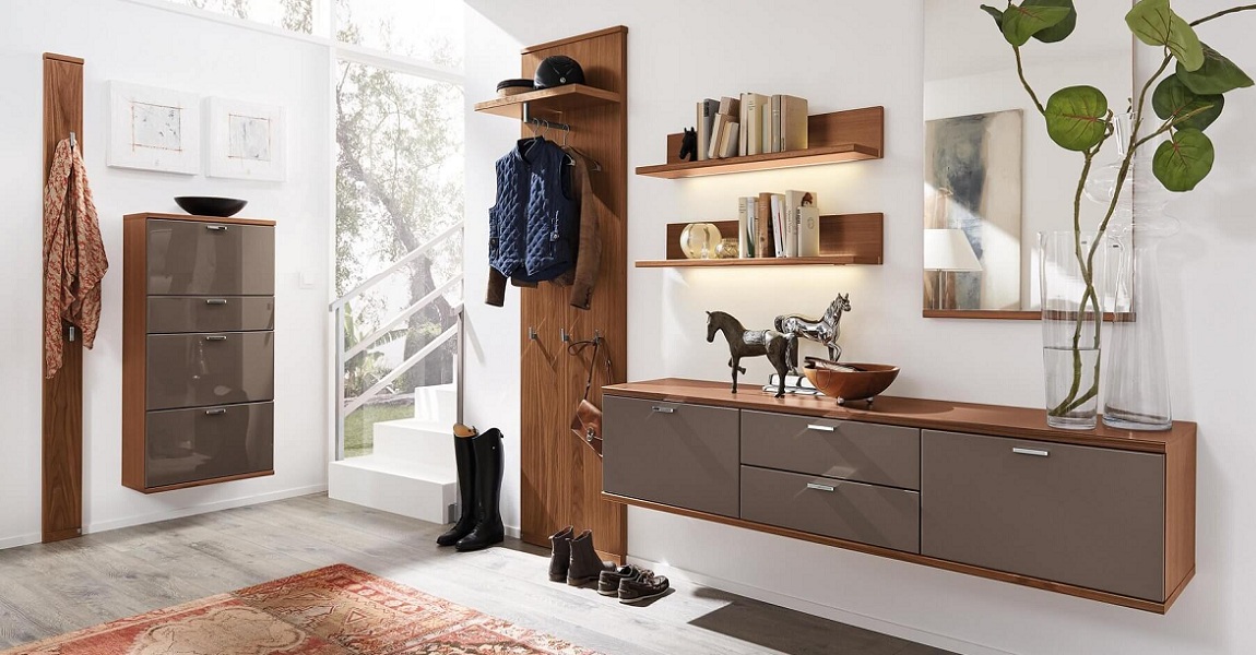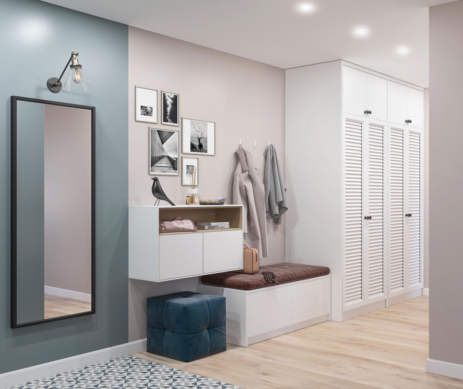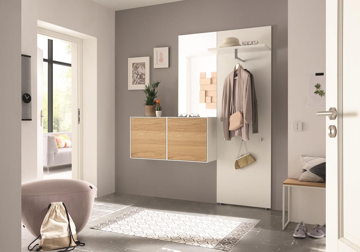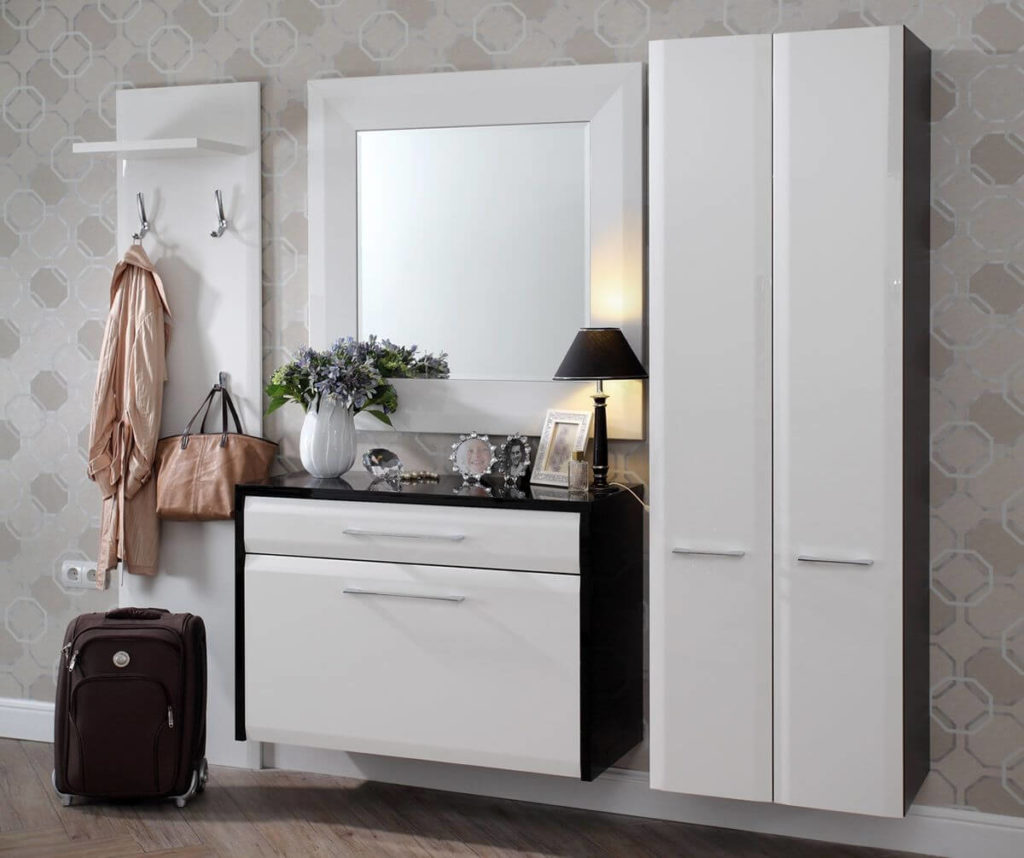 Les armoires suspendues sont idéales pour les petits couloirs, car elles n'encombrent pas l'espace. Visuellement, la structure a l'air aérée, car elle est fixée au mur. Il y a encore assez d'espace sous la bordure pour mettre des chaussures de ville ou placer un support à chaussures.