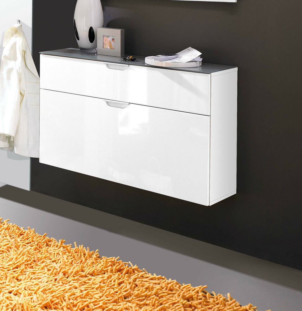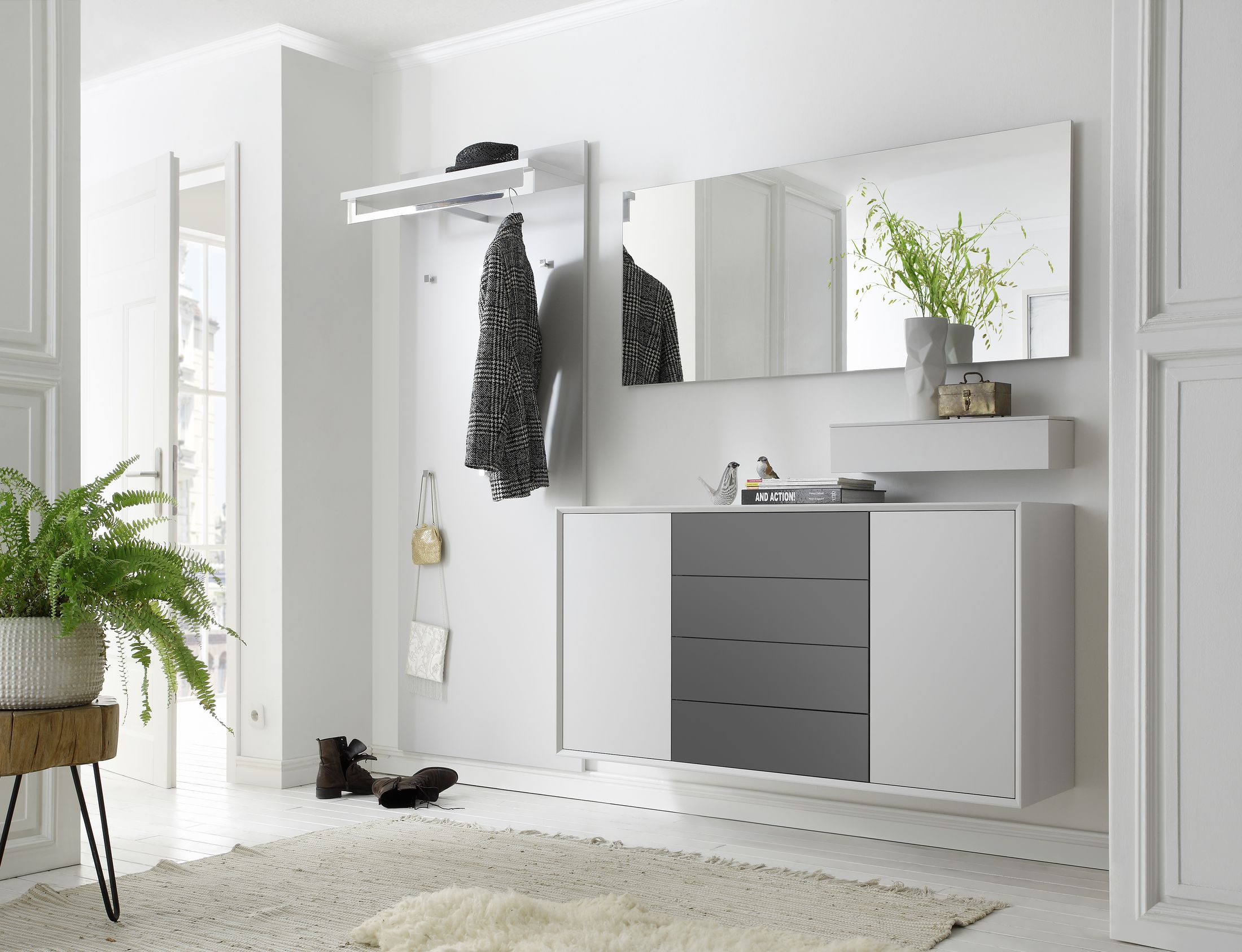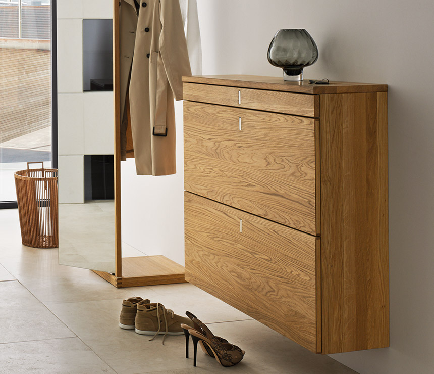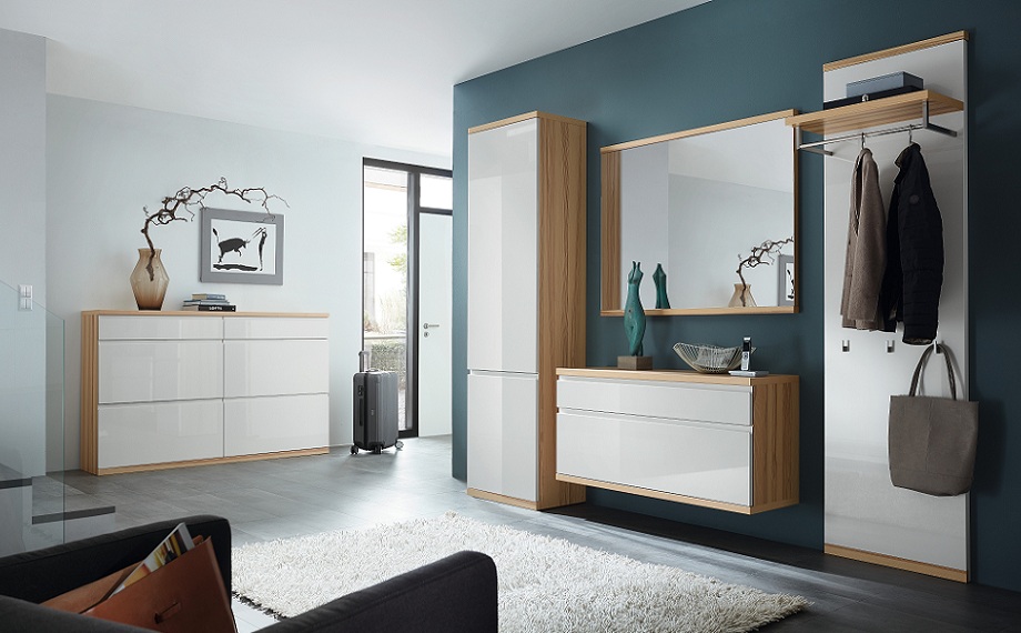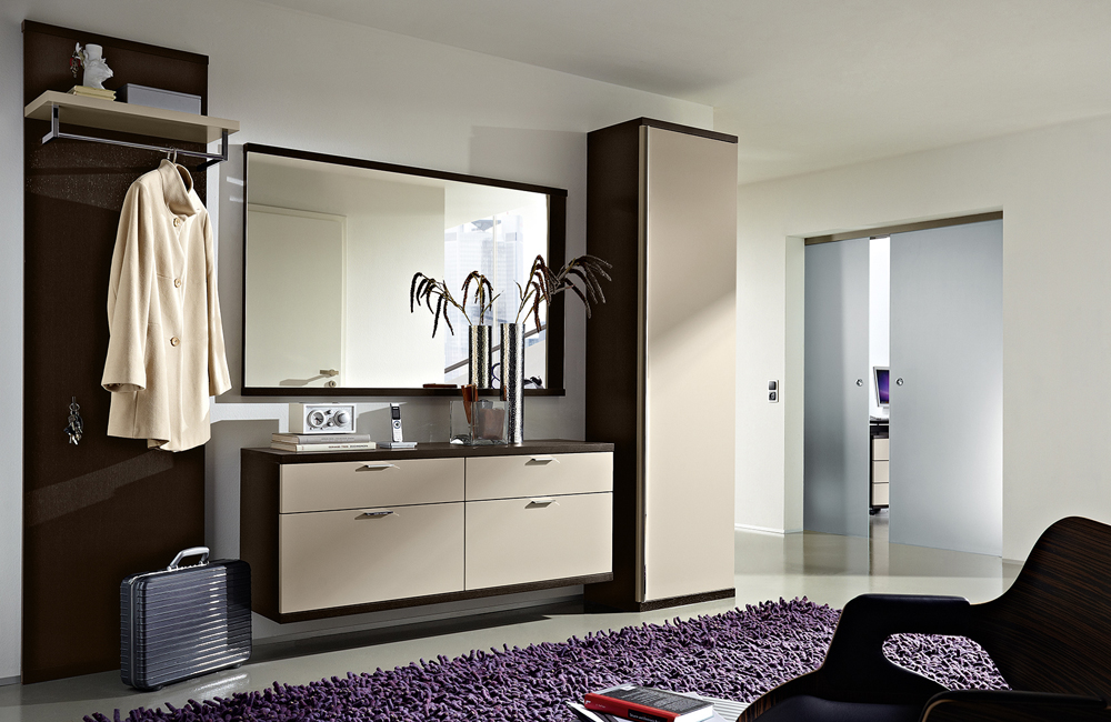 Les armoires suspendues sont idéales pour les petits couloirs, car elles n'encombrent pas l'espace. Visuellement, la structure a l'air aérée, car elle est fixée au mur. Il y a encore assez d'espace sous la bordure pour mettre des chaussures de ville ou placer un support à chaussures.