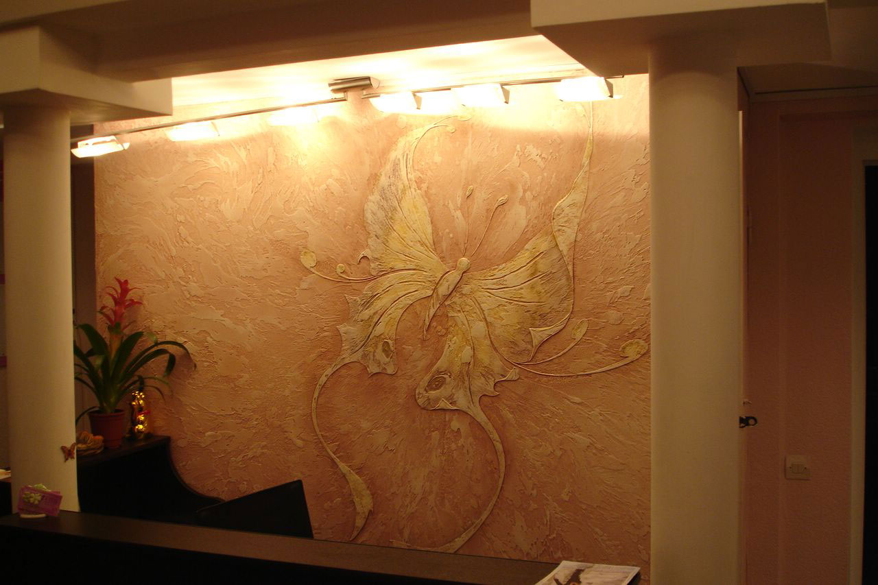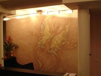 À l'aide de papier peint liquide sur le mur, vous pouvez organiser un dessin original. Une telle décoration deviendra un accent visuel et un intérieur. L'image peut être pour tous les goûts - des petites abstractions aux toiles entières. La masse épaisse peut être utilisée pour créer du stuc. Une excellente option pour décorer une pièce dans un style classique.