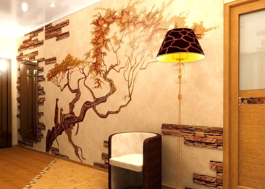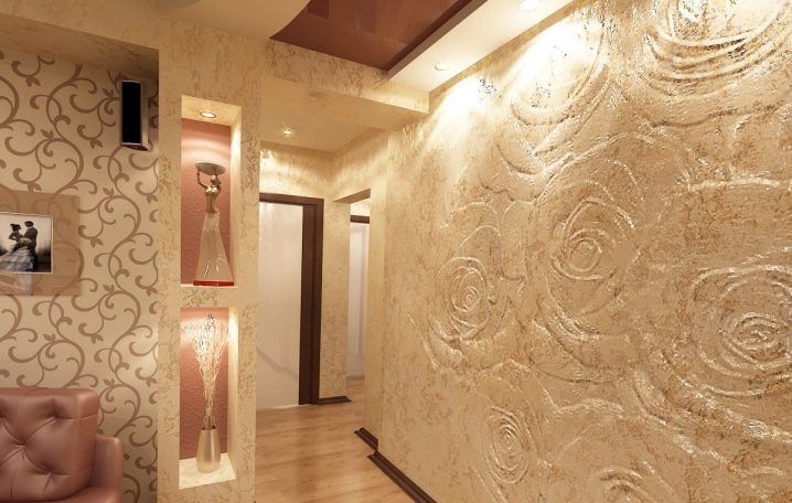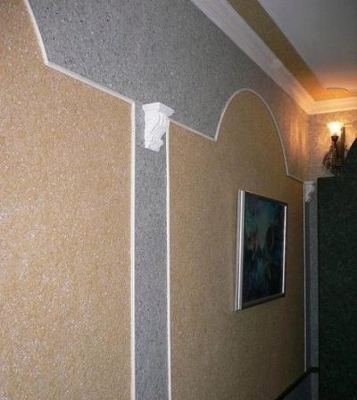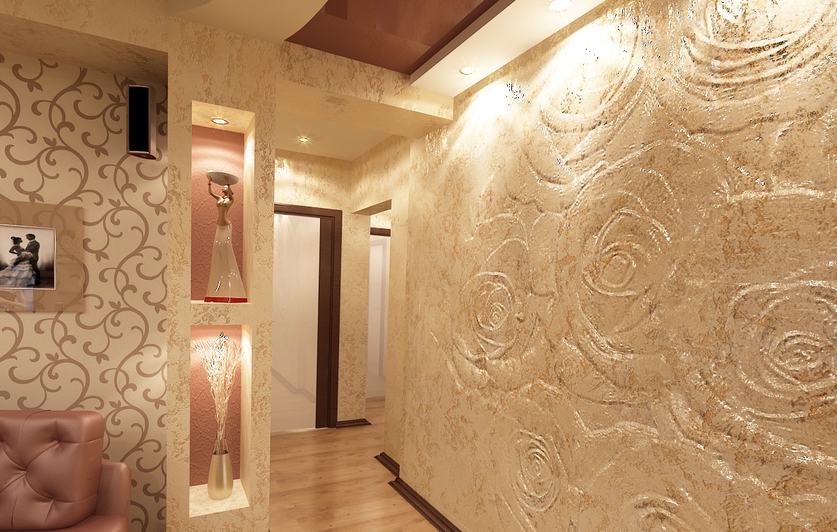 Le papier peint liquide dans le couloir est harmonieux dans différents styles d'intérieur. Un large choix de textures et de couleurs vous permet de choisir la meilleure option pour un intérieur spécifique. Ils sont utilisés à la fois pour la décoration de pièces standard et pour créer des motifs complexes et volumineux.