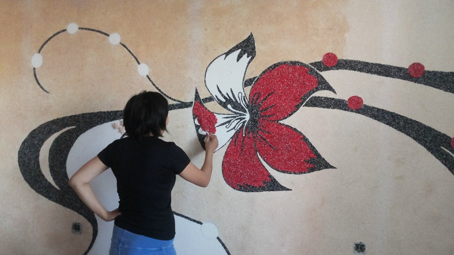 Design original utilisant des papiers peints liquides de différentes couleurs. Les nuances contrastent et se complètent à la fois.