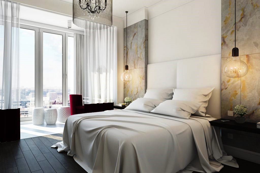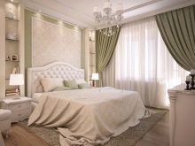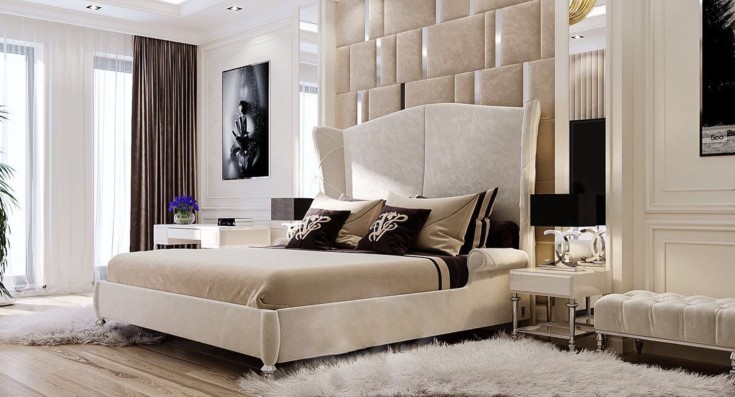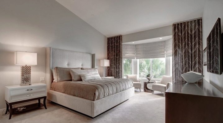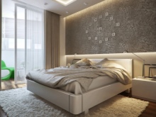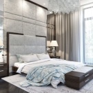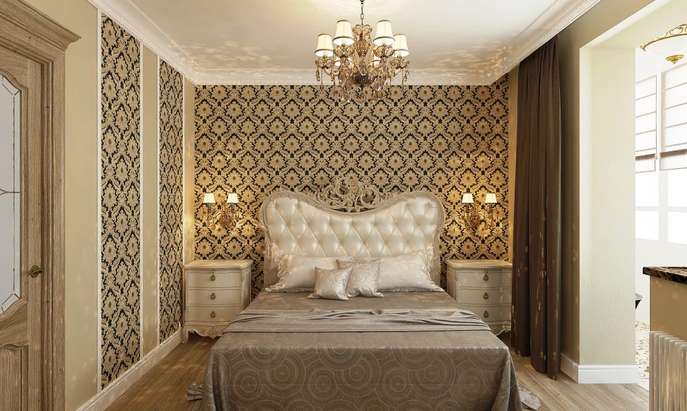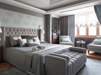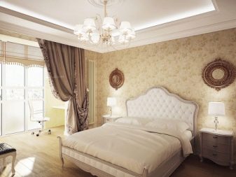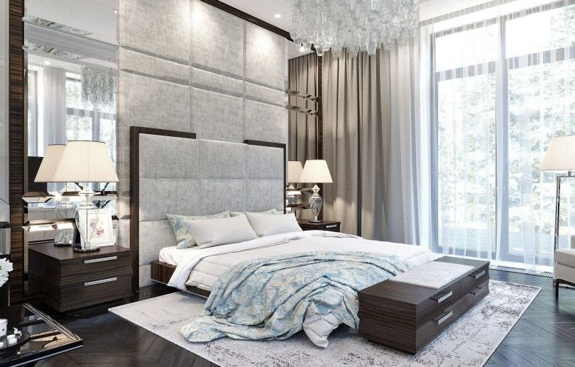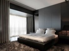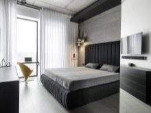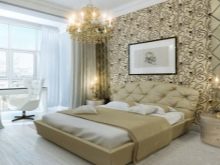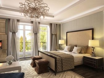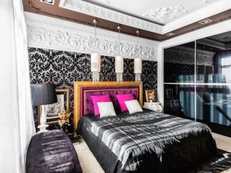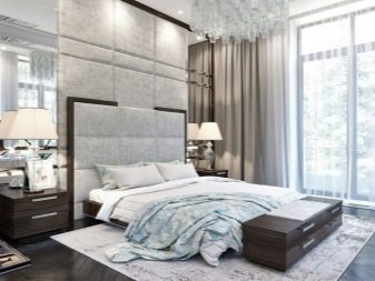 Les façades de meubles doivent avoir un aspect nettement coûteux. En général, vous pouvez décorer la pièce dans des couleurs claires neutres ou dans des contrastes sombres.La deuxième option est principalement utilisée lorsqu'ils souhaitent ajouter des références à l'Art Déco. Les sols sont décorés dans des tons brunâtres, parfois presque noirs. Il est recommandé de décorer la zone de couchage avec des ornements.