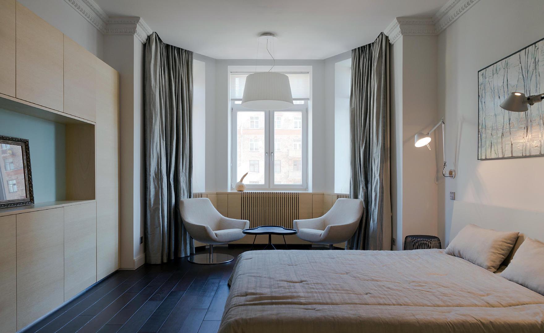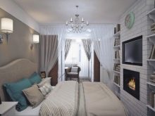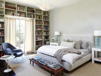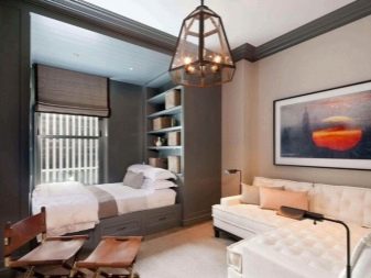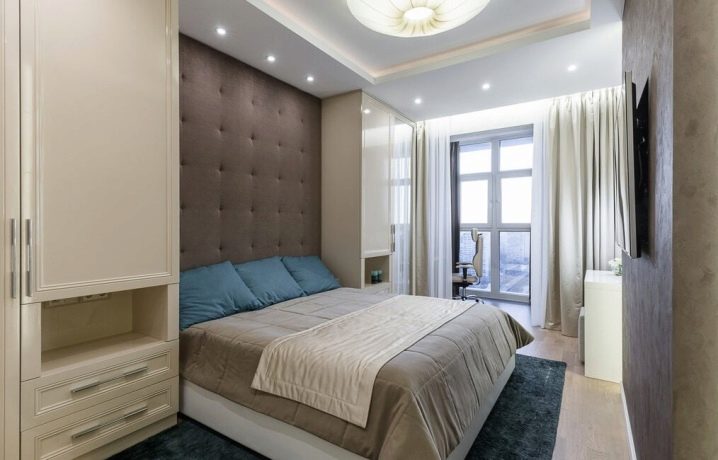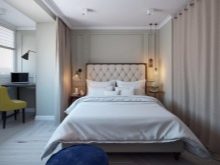 Dans certains cas, il est nécessaire d'améliorer l'apparence d'une chambre d'une superficie de 17 ou 18 mètres carrés. m. Le plus souvent, ils essaient de les rapprocher visuellement du rectangle. Les armoires sont placées sur les côtés près de la tête de lit. Les armoires suspendues sont souvent utilisées à la place des tables de chevet. La division de l'espace se fait à l'aide d'un rack ou de rideaux.