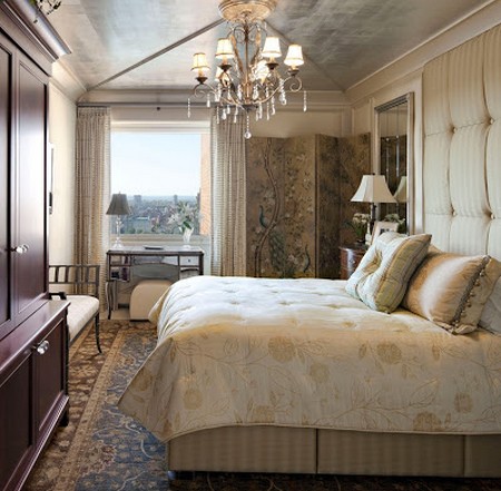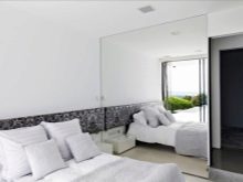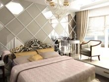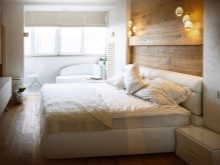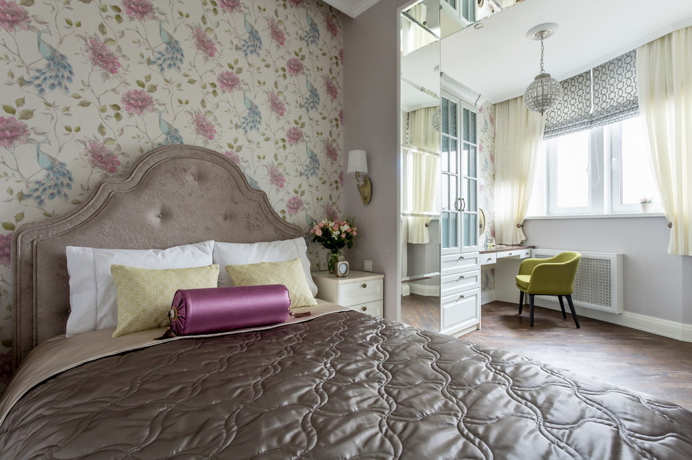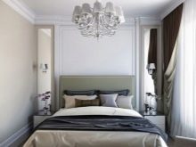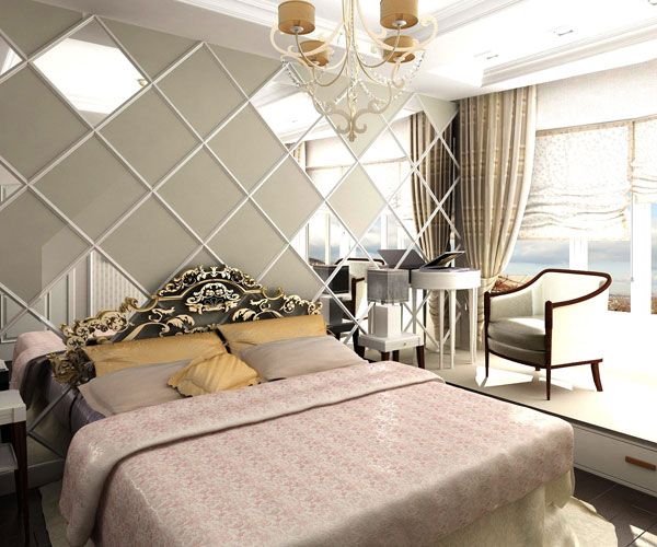 Une chambre relativement petite de 9-10 m². m. s'installe sans aucun problème. Les miroirs suspendus aident à repousser les murs d'une pièce inutilement étroite. Afin de ne pas les mettre en plus, des armoires coulissantes à portes miroirs sont utilisées. L'utilisation de couleurs claires est encouragée. Une chambre carrée implique le placement des objets principaux au milieu, mais vous ne devez pas oublier les coins.