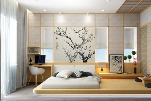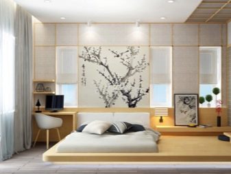 Le style japonais authentique est créé strictement à partir de matériaux naturels. Les plafonds sont blanchis à la chaux ou recouverts de poutres en bois ; vous pouvez utiliser ces deux techniques. La division de l'espace en zones est réalisée à l'aide d'écrans en papier. L'augmentation de la luminosité de la pièce n'est pas nécessaire. Cependant, les accents juteux simples sont acceptables.