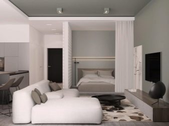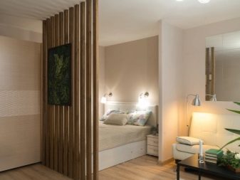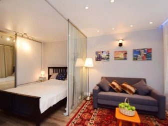 Le lit peut être séparé de l'espace principal de la pièce par trois cloisons mobiles légères, qui créeront une sorte de niche - cela ajoutera du confort à votre couchage.