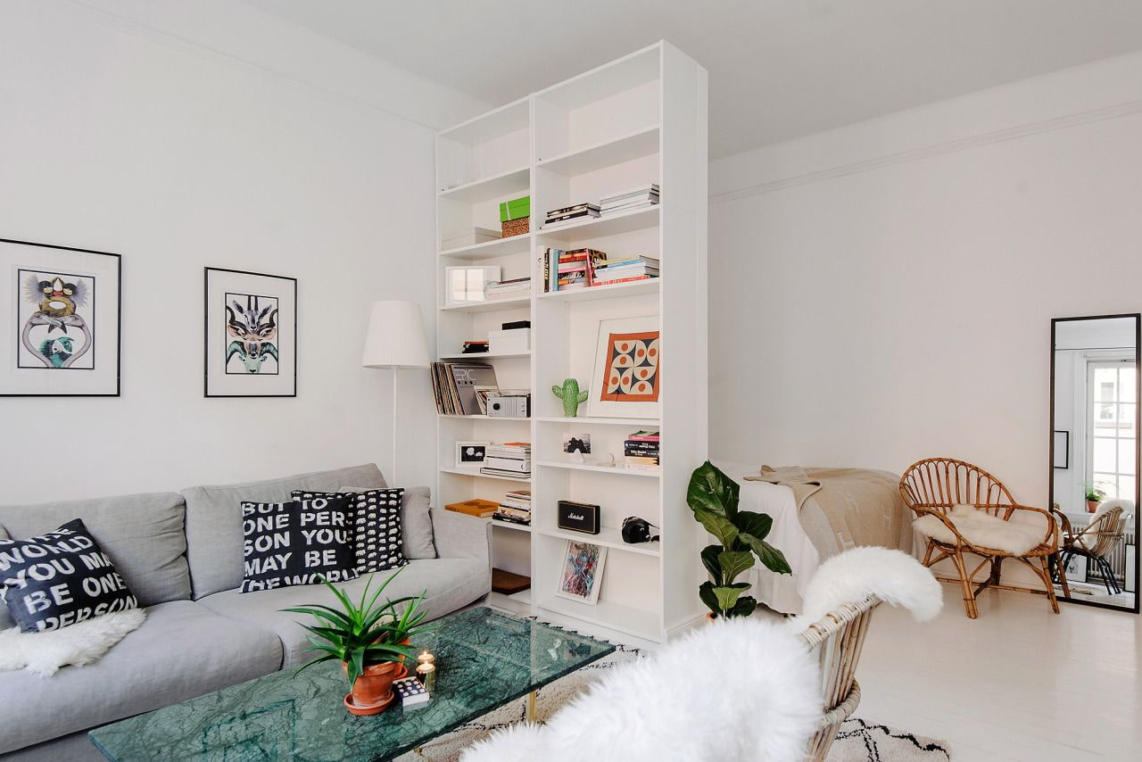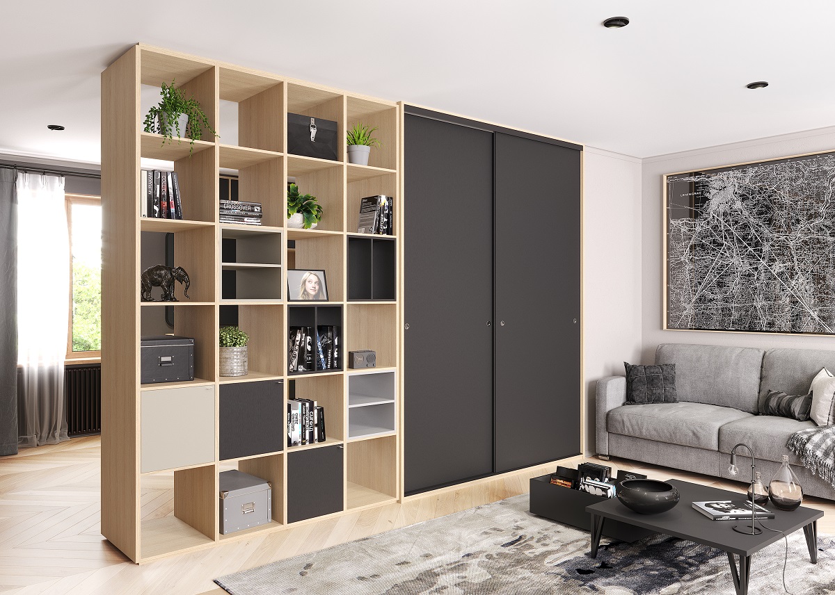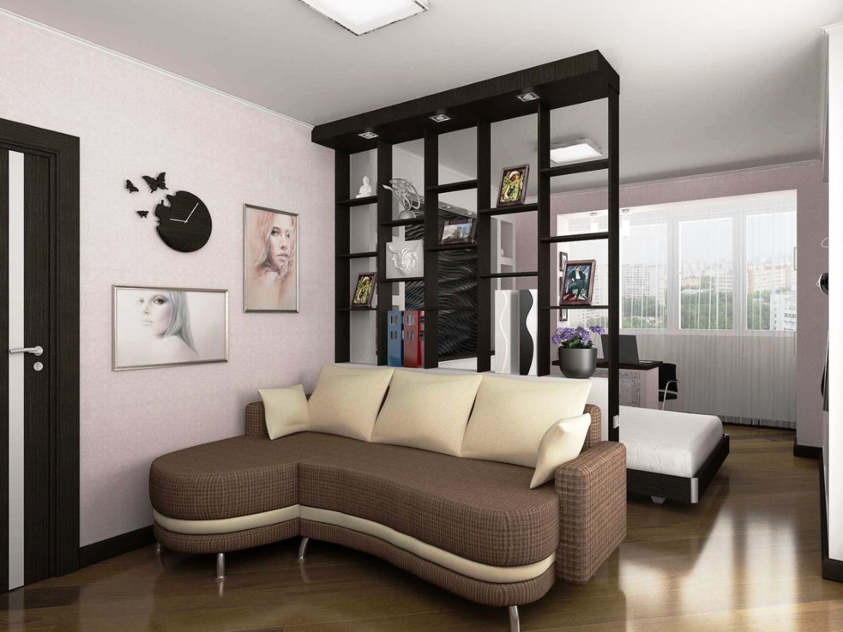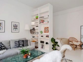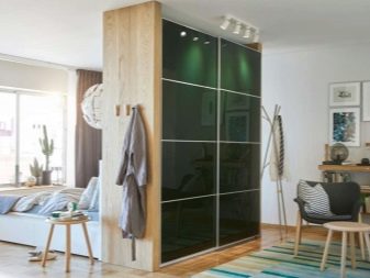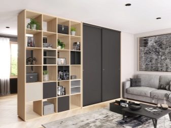 Si, en plus de la séparation habituelle, vous souhaitez que ces mêmes séparateurs apportent au moins un avantage, alors pourquoi ne pas recourir à de petites bibliothèques ou armoires pour vêtements et chaussures. Vous pouvez, par exemple, sélectionner spécialement des armoires de hauteurs complètement différentes afin d'éviter délibérément l'effet d'un mur plein. De plus, si la pièce est lumineuse, alors sur ces mêmes armoires, vous pouvez mettre de beaux pots avec toutes sortes de plantes et de fleurs.