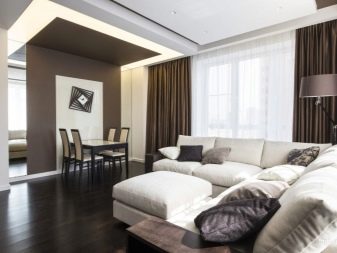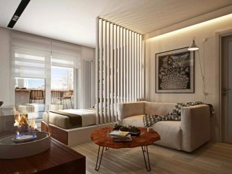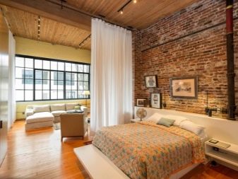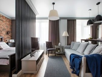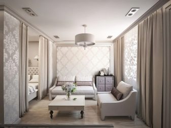 Probablement, La façon la plus simple et la plus polyvalente de diviser une pièce est de suspendre des rideaux. Cela vous permettra à tout moment de la journée et selon votre humeur de combiner et déconnecter les zones précédemment créées. Et si vous n'aimez pas cette idée avec le temps, vous pouvez simplement retirer les rideaux vous-même.