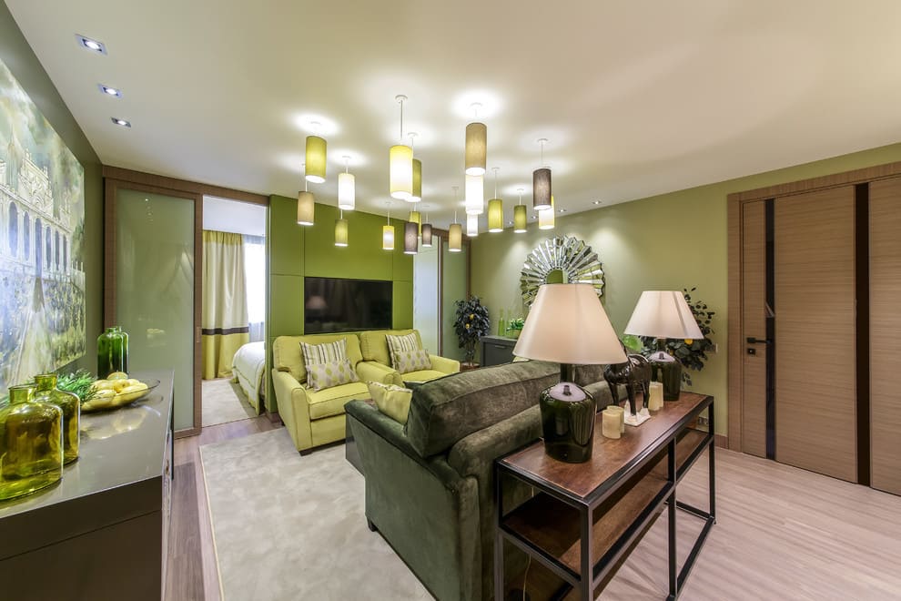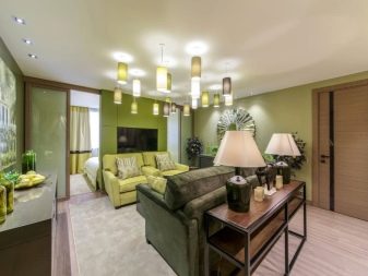 Lors de l'organisation de l'éclairage, il faut partir d'une règle si simple qu'il est recommandé de privilégier la lumière naturelle dans la chambre pour un meilleur sommeil et un bon repos, mais les sources de lumière artificielle conviennent tout à fait dans le salon. Pour cela là vous pouvez accrocher un grand lustre avec un éclairage puissant, dont la lumière pénétrera même dans les coins les plus éloignés de la pièce. L'utilisation de lampadaires et de lampes de table n'est pas interdite.