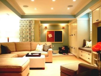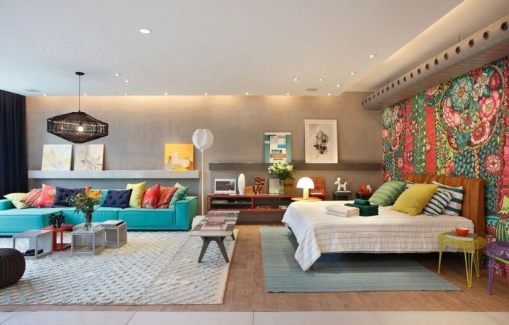 Il est intéressant d'expérimenter avec des tapis de différentes couleurs, et même de styles. Cela créera visuellement une division en zones qui ont des objectifs complètement différents: de l'aire de jeux à l'endroit où le propriétaire de la maison vaque à ses affaires et décide des problèmes importants. Le même effet peut être obtenu en appliquant un éclairage dans une grande variété de tons.