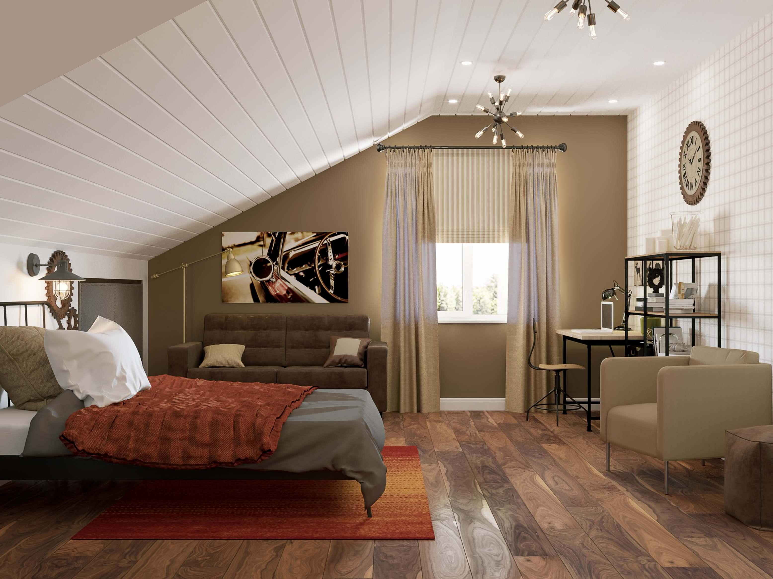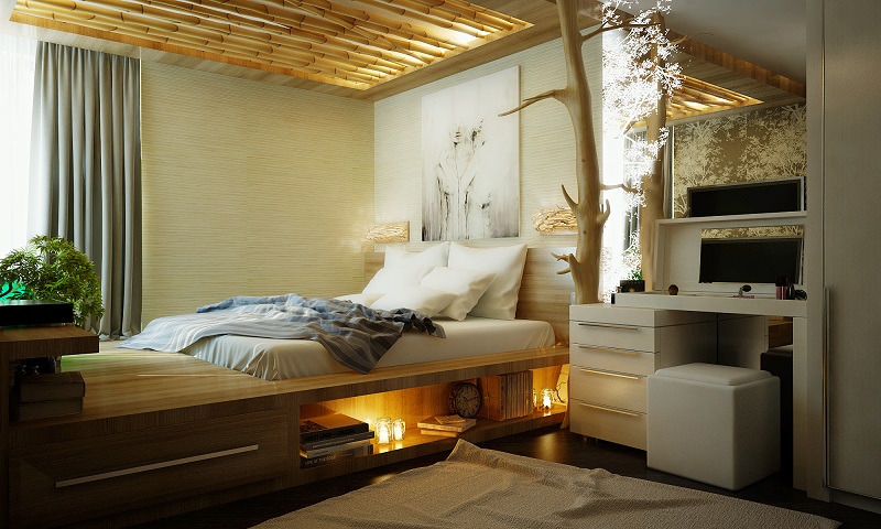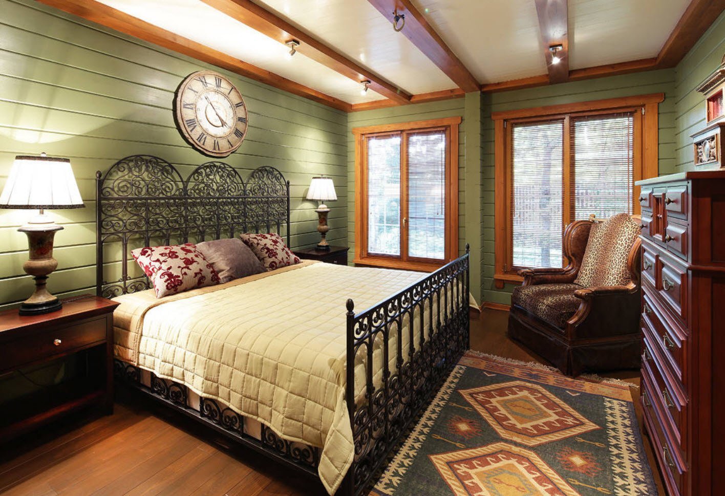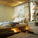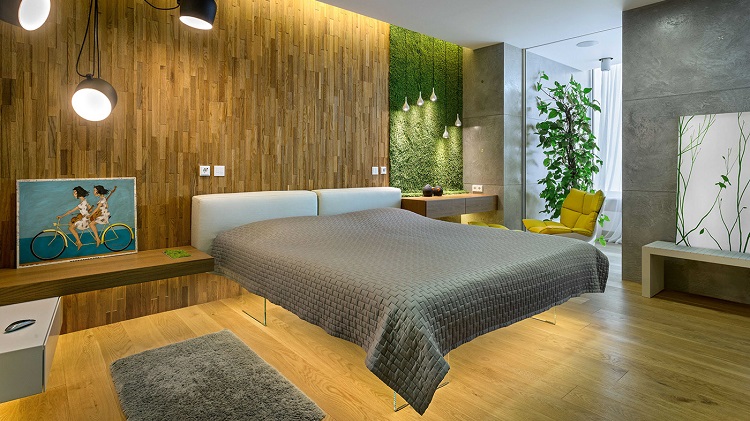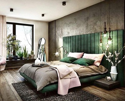 Cette direction incarne le naturel et le naturel. Ces caractéristiques sont parfaites pour une ambiance de chambre à coucher. Les couleurs principales sont les nuances de vert et de brun. Il est recommandé d'utiliser des garnitures en bois naturel pour la décoration murale. Les plantes vivantes sont souvent agitées dans la pièce. Vous pouvez également utiliser les finitions suivantes :