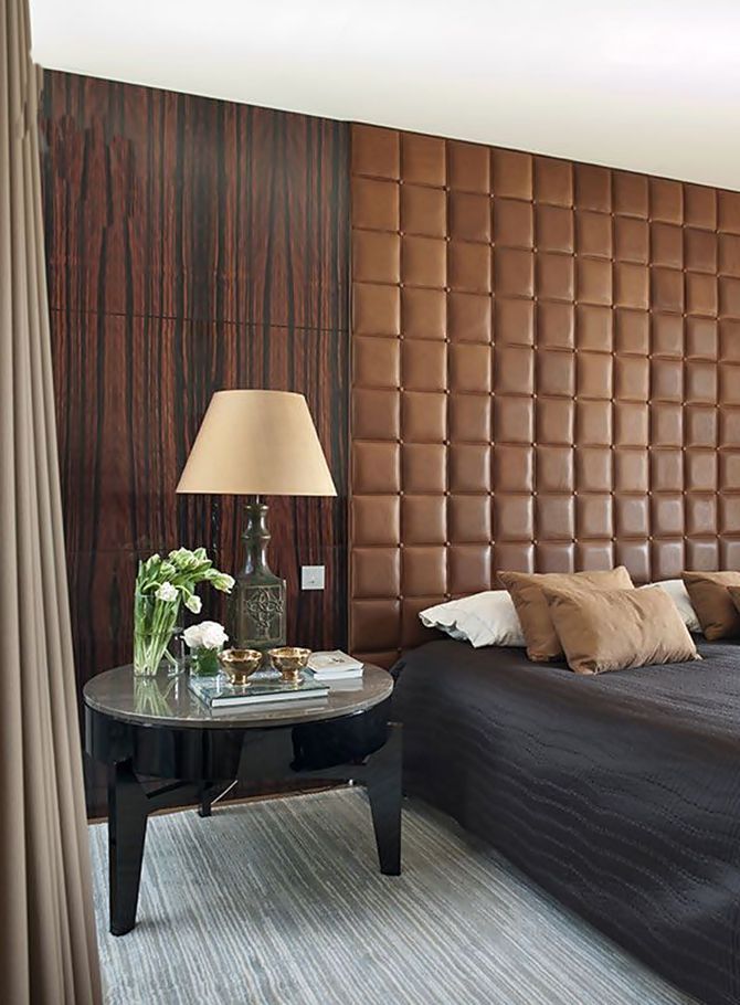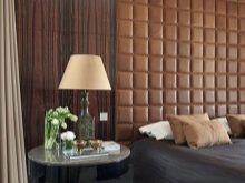Les murs inégaux peuvent être décorés avec des toiles en cuir écologique. Ce matériau ajoutera un confort et un confort supplémentaires à l'intérieur. Il est très simple de prendre soin du matériel, il suffit juste d'essuyer périodiquement la peau avec un chiffon humide. Décorer les murs avec de l'éco-cuir est un nouveau design qui ne s'est pas encore généralisé.