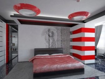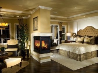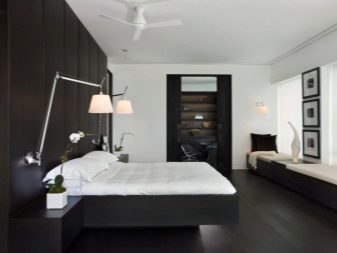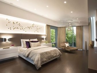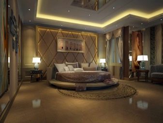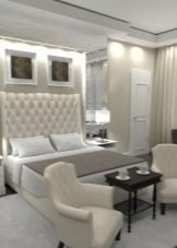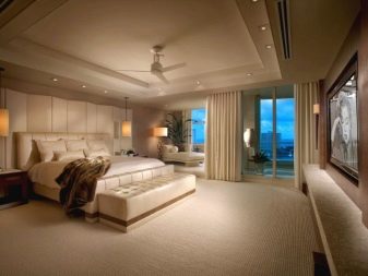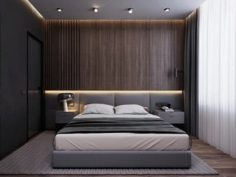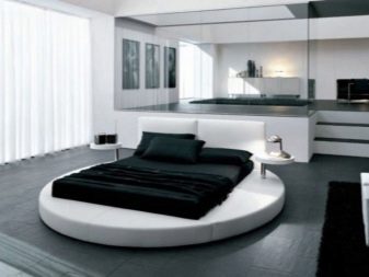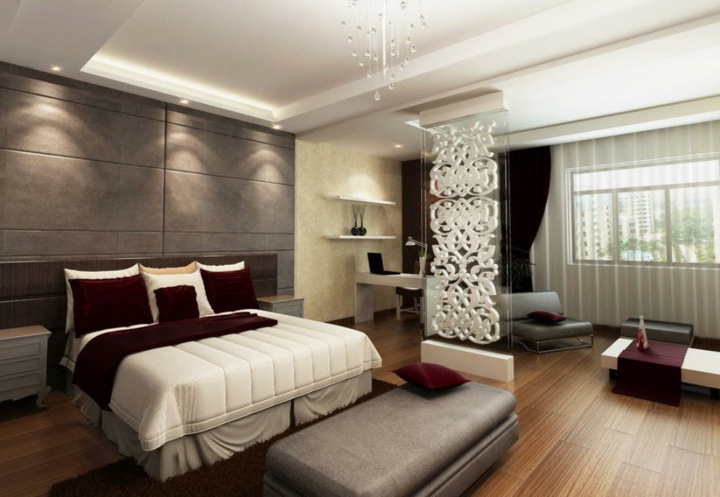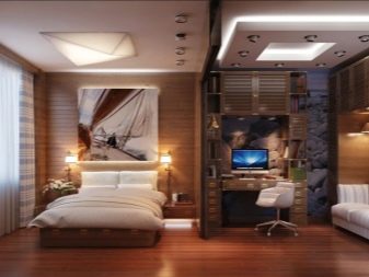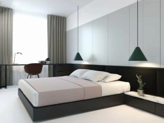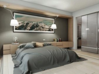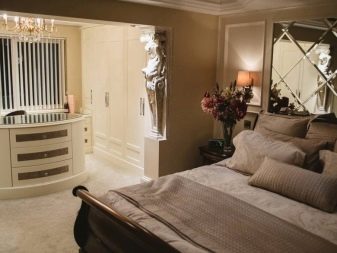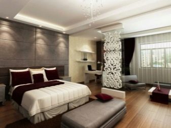 Si la pièce est trop grande, elle peut être divisée en deux zones : dormir et travailler. Ce dernier contient un canapé, un fauteuil et une télévision. La salle de bain et le dressing sont situés dans des pièces différentes. Dans les maisons privées, très souvent, la zone de travail est sortie dans une pièce séparée, située à côté de la chambre. Aujourd'hui, vous pouvez créer presque toutes les options pour l'emplacement des zones fonctionnelles.