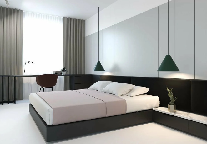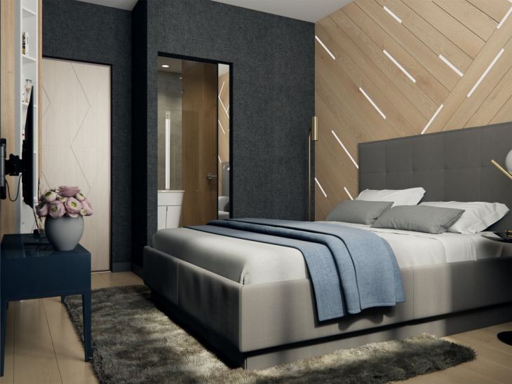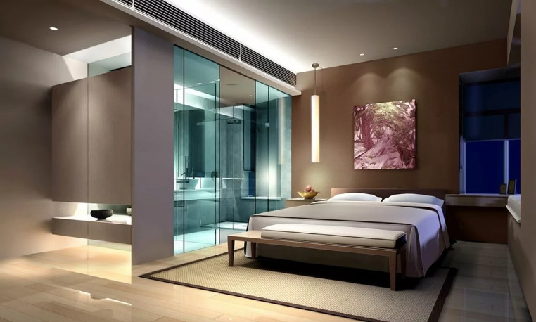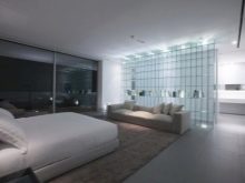 - Conception de la chambre principale dans un style moderne. La salle de bain est clôturée avec une cloison, ce qui rend la pièce assez élégante et intéressante.