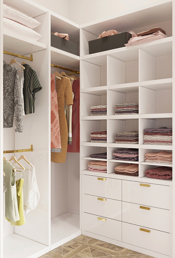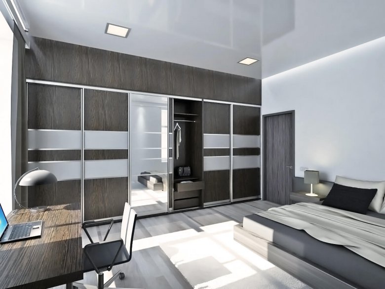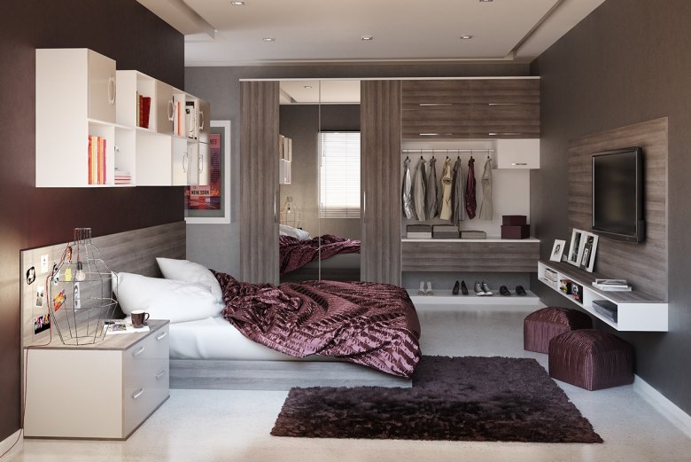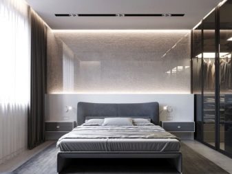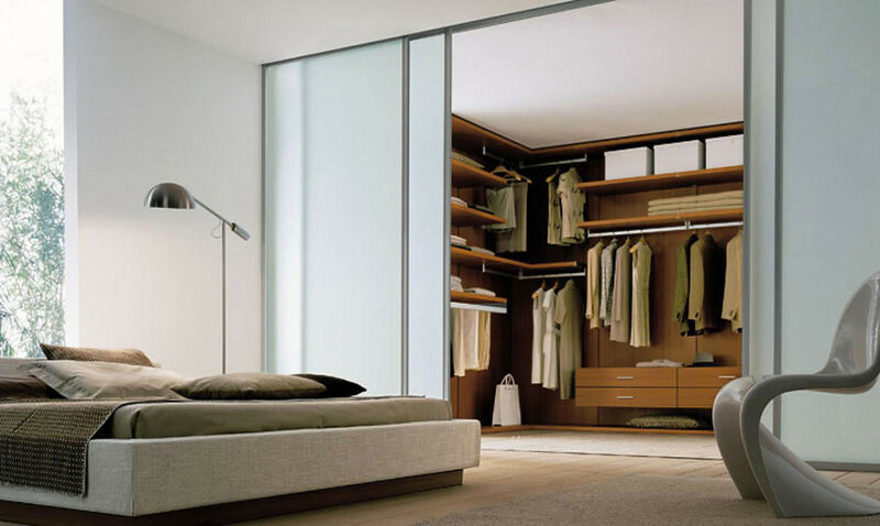 - L'idée de \ u200b \ u200b concevoir une chambre principale dans le style du minimalisme avec un grand dressing, clôturé avec une cloison.