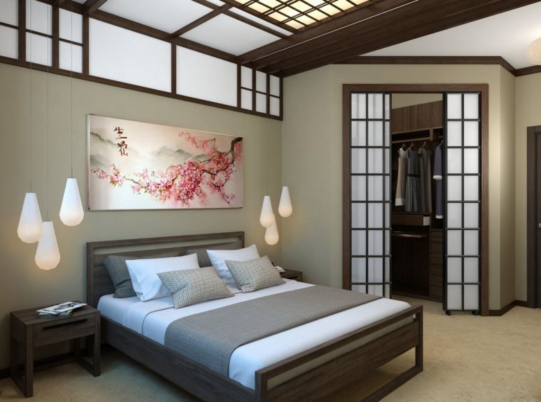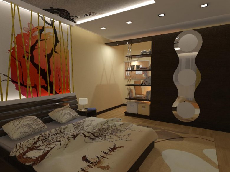 - Style japonais. Cela implique la nécessité d'utiliser plusieurs schémas de couleurs qui seront parfaitement combinés les uns avec les autres. La combinaison la plus populaire est le marron, le rouge et le beige. De plus, un tel intérieur doit être décoré de plantes, de lampes diverses et d'accessoires orientaux.