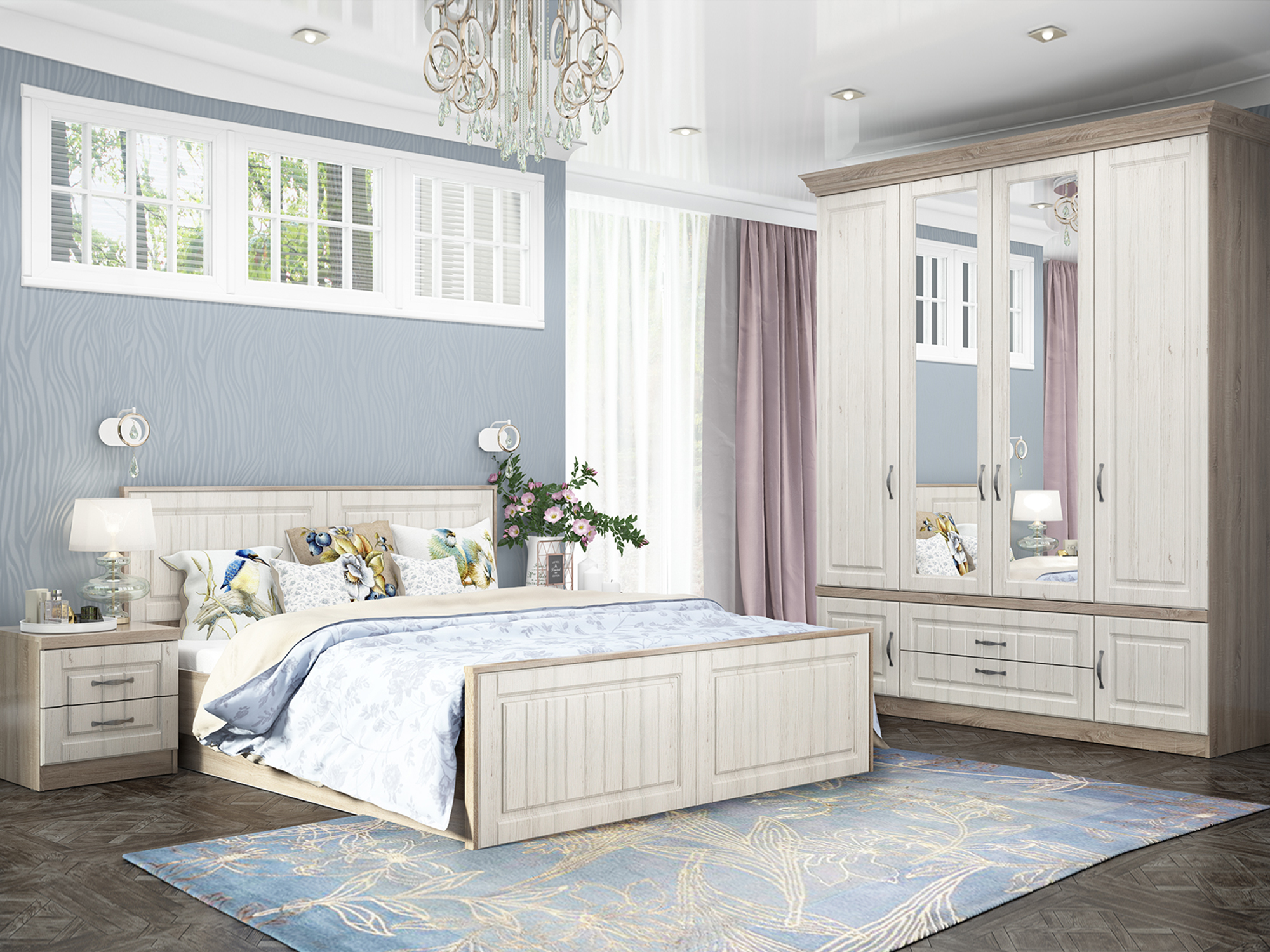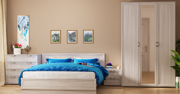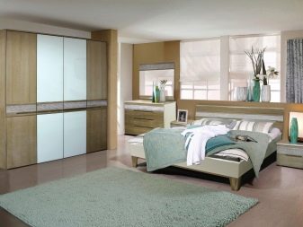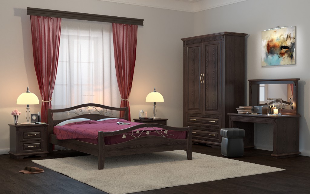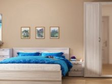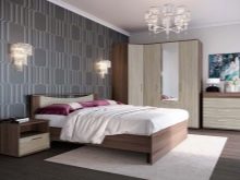 L'ensemble convient aux petites tables de chevet à pieds carrés, avec deux tiroirs, une commode de 970x480x980 mm à partir de trois grands et deux petits tiroirs, une armoire au design à deux ou trois vantaux. Un miroir 1000x800 mm sera utile.