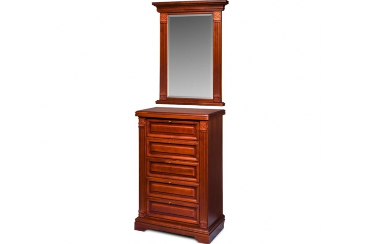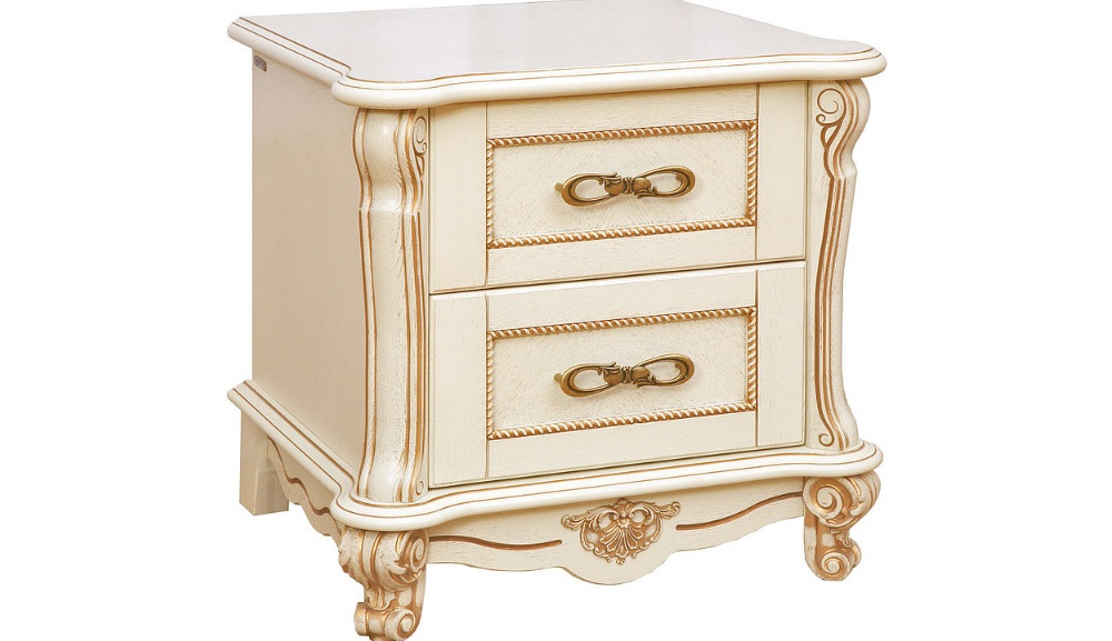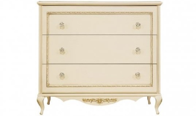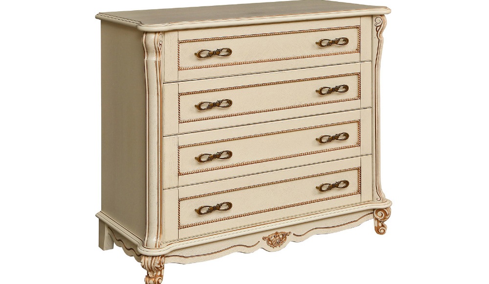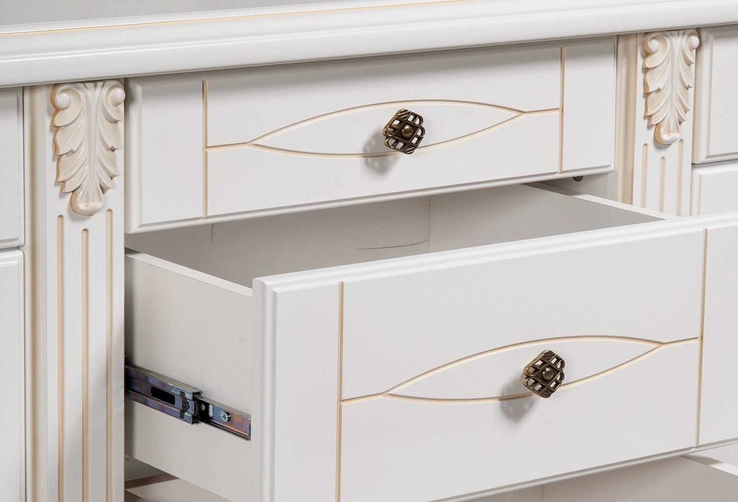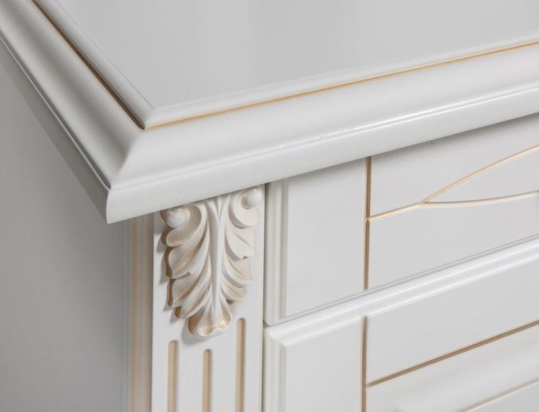 La commode se compose de trois grands tiroirs et de deux petits. Ses dimensions sont de 1270x 549x1041 mm. L'ensemble est complété par un miroir mesurant 1263x1046 cm, il est installé au dessus de la commode. Toutes les façades des produits sont décorées de sculptures dorées. Le kit est très populaire parmi les consommateurs européens.